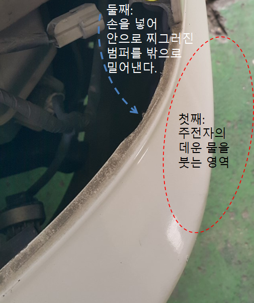3. 아래 사진의 그림처럼 찌그러진 부위 범프 내측으로 손을 넣어 밖으로 밀어낸다.