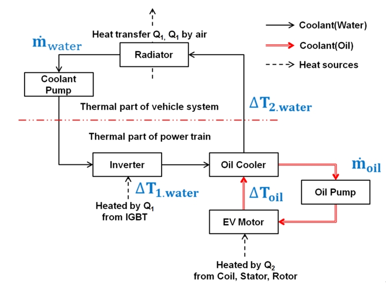 위의 그림은 현재 차량용 구동모터에 적용되고 있는 유냉방식을 설명하기 위해 냉각수와 오일 그리고 열의 이동을 표기한 그림입니다. 그림과 같이 모터의 인버터에 전원이 인가되면 인버터와 모터에서 열이 발생하게 됩니다. 이때 인버터의 열은 냉각수가 가져가고, 모터의 열은 오일이 냉각하는 개념입니다. 냉각 오일은 오일 펌프를 통해 모터 내부로 다시 유입되어 코일을 냉각한 후 모터 외부로 이동하게 됩니다. 가열된 오일은 오일쿨러(oil cooler)에서 냉각수와 오일 간의 열교환(heat exchange)으로 냉각되고 다시 모터로 유입되어 순환하게됩니다.