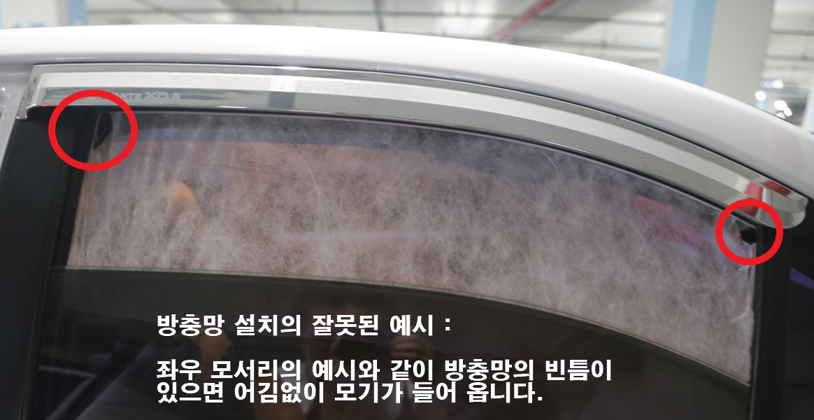 네 번째로는 창문을 어느 정도 열고 잠을 자야 했기 때문에 다이소에서 2천원 주고 구입한 방충망 설치가 필수이고, 모기가 들어오지 못하도록 방충망 제품에 포함되어 있는 양면테이프를 이용, 차창에 방충망을 붙이는 공사를 잘해야 합니다.
