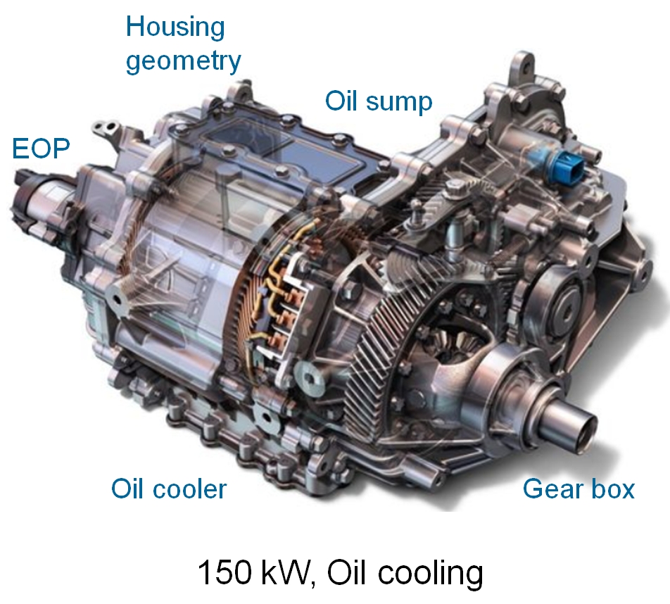 아래 그림은 대표적인 유냉방식이 적용된 전기모터의 레이아웃이 됩니다. 모터 상부에는 오일이 머무를 수 있는 오일 섬프(oil sump)가 있고 오일을 순환 시킬수 있는 전동 오일 펌프(EOP : Electric Oil Pump)가 모터에 장착되어 있는 것을 볼 수 있습니다. 그리고 모터 하부에는 중요한 부품 중 하나인 열교환기 역할을 하는 오일쿨러(oil cooler)가 장착되어 있는 것을 확인할 수 있습니다.