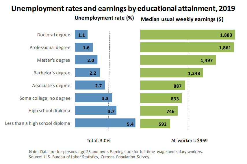 도표 3-3은 미국 노동청이 추산한 2018년도 실업률과 소득 수준 통계를 보여준다. 통계에서 보이듯 교육 수준은 소득 수준과 양의 상관관계를 가지며 실업률과는 음의 상관관계를 갖는다. 쉽게 말하자면 교육수준이 높을수록 돈을 많이 벌고 직장을 잃을 가능성이 줄어드는 것이다.