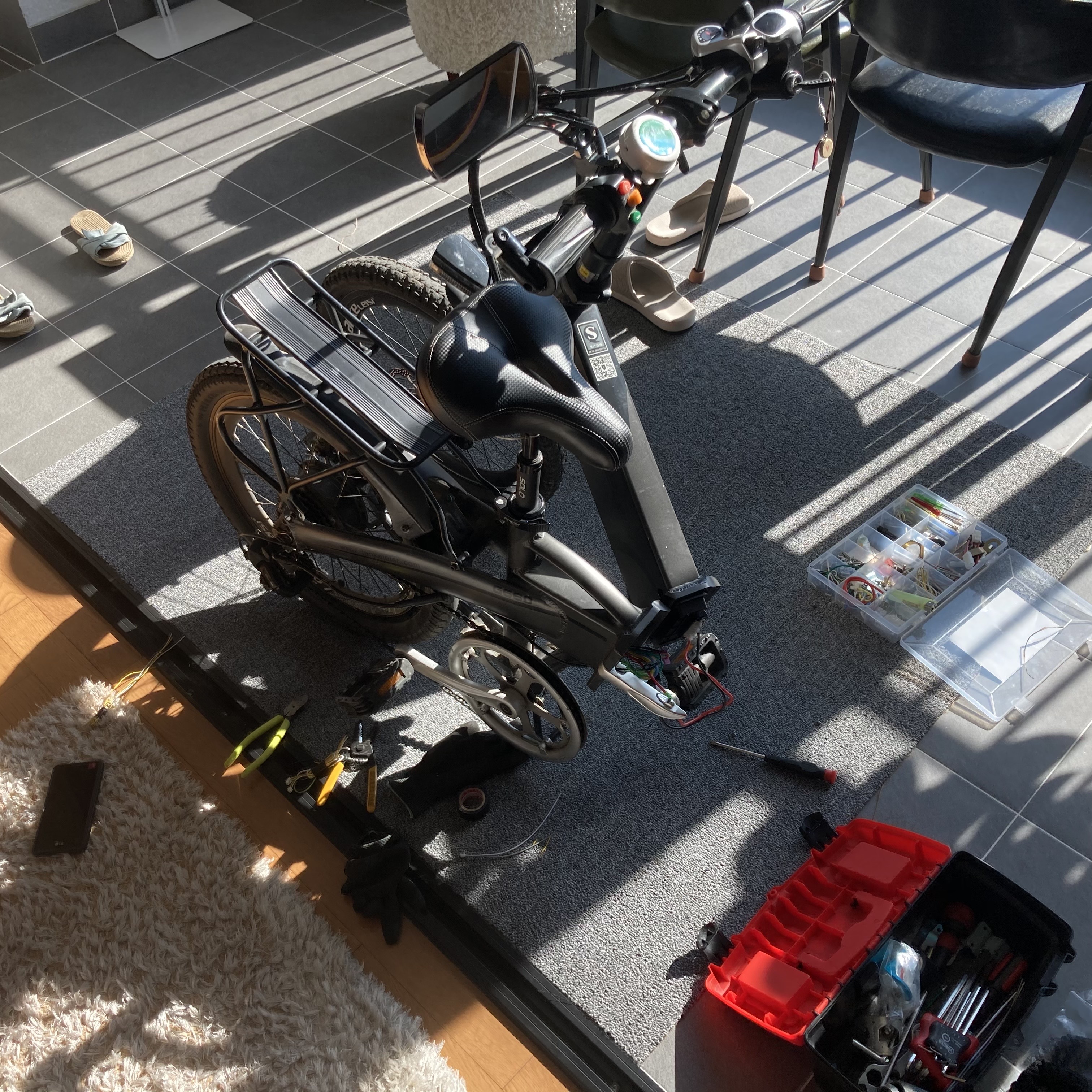 일단 당일 저녁 약속이 있던터라 자전거를 집에 두고 약속장소로 이동하였고, 다음날 눈에 보이는 온갖 케이블을 점검했음에도 불구하고 고장해결을 못했습니다. 결국 무게를 줄이기 위해 배터리를 제거한 후 무동력으로 회사에 출근해 보았습니다.