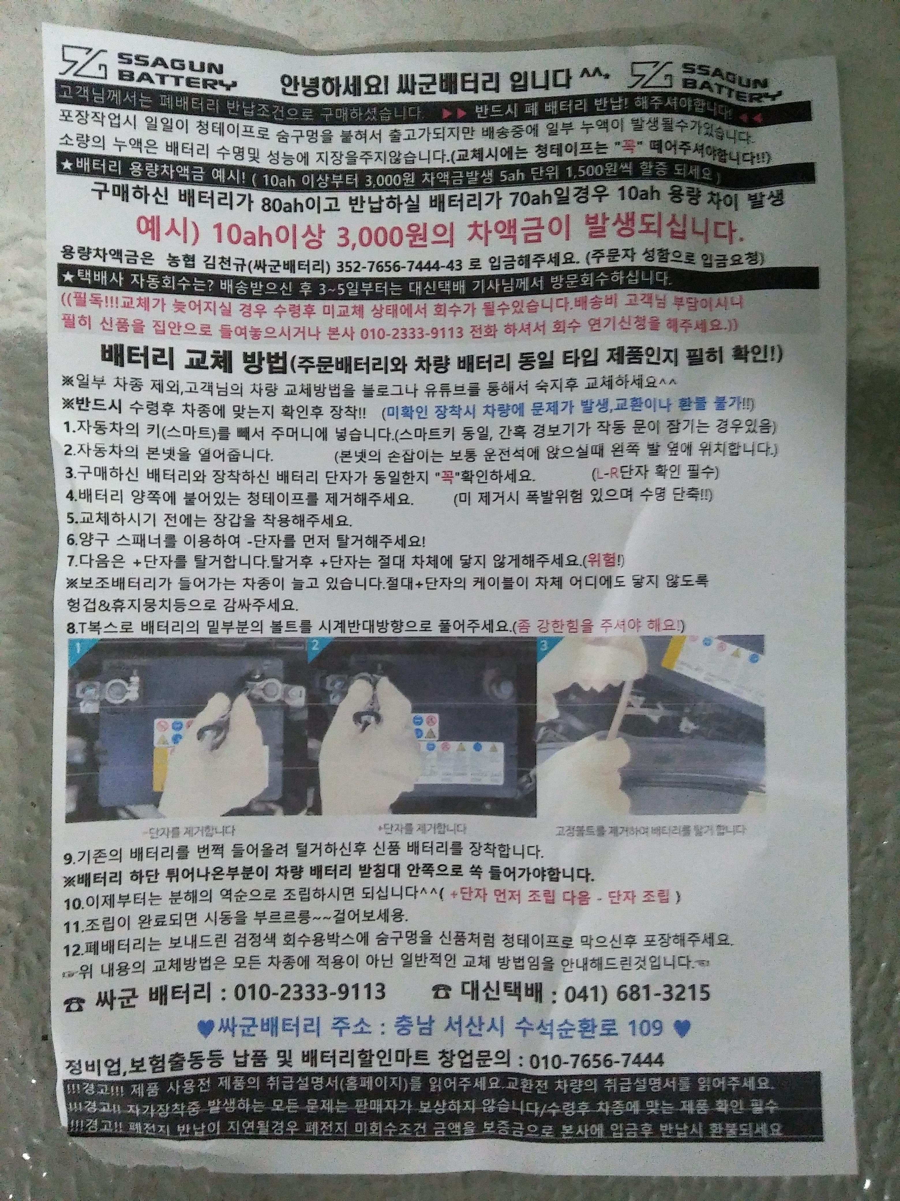 그림 1 : 결재 후 2-3일 내에 아래의 검은색 박스에 새로운 배터리, 공구 2개, 설명서 한 장이 배송된다.
