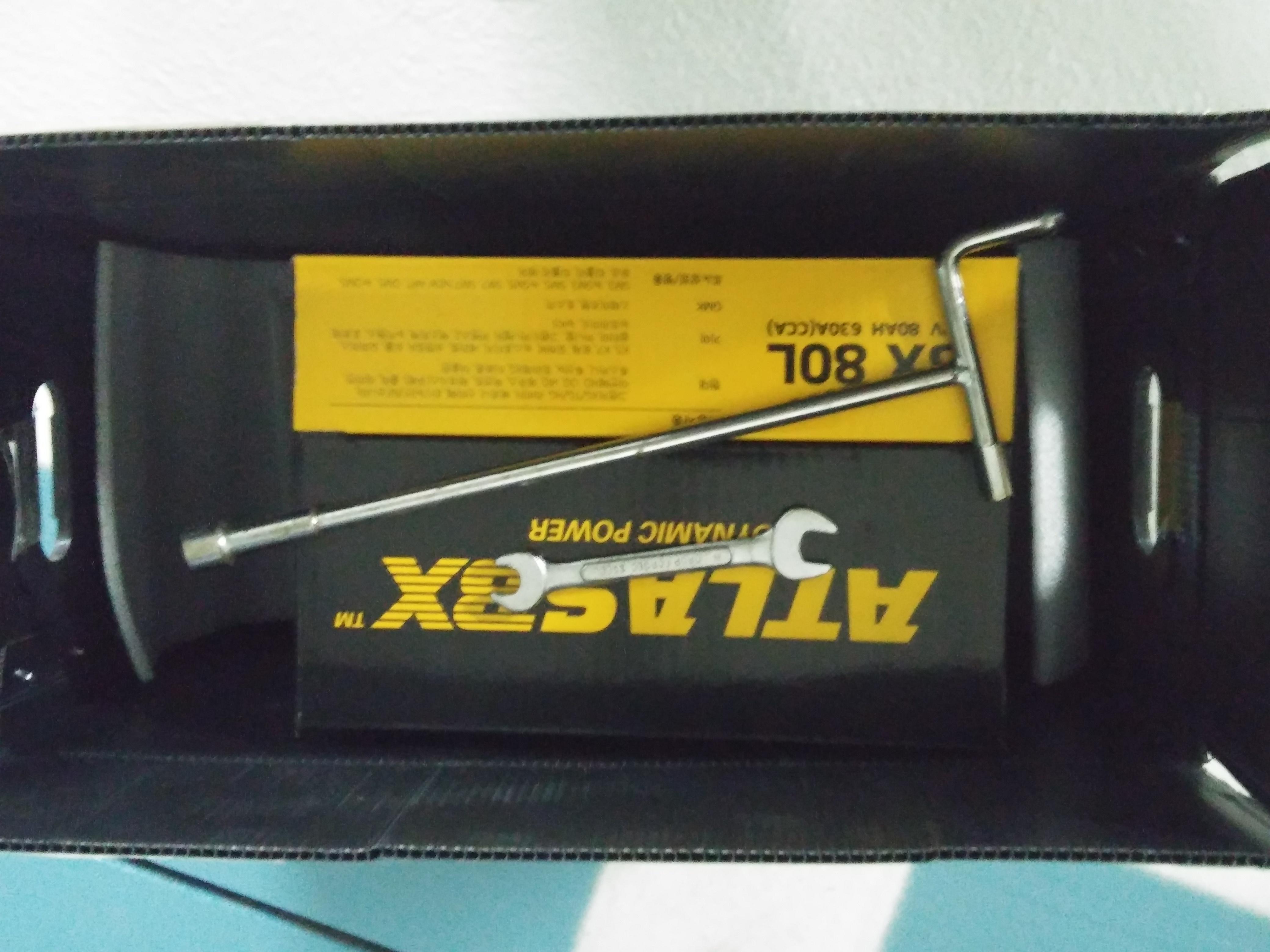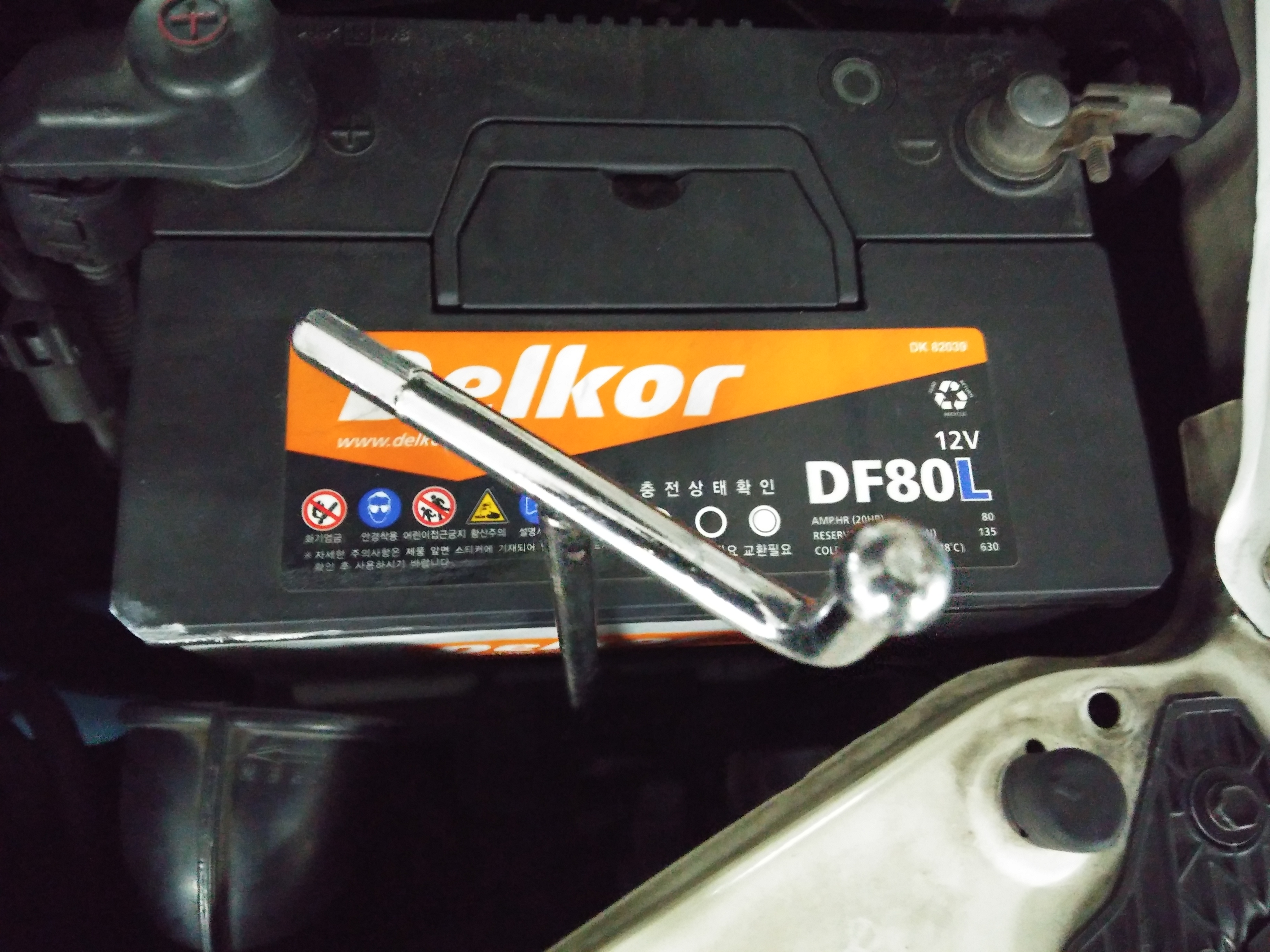 그림 8 : 교체해야 할 배터리를 차에서 분리한다. 아래 공구 사진과 같이 배터리 고정부의 너트를 분리한다. (작업 순서는 포함된 A4에 상세하게 설명되어 있다. +, - 순서가 중요한가 보다. 그대로 했다.