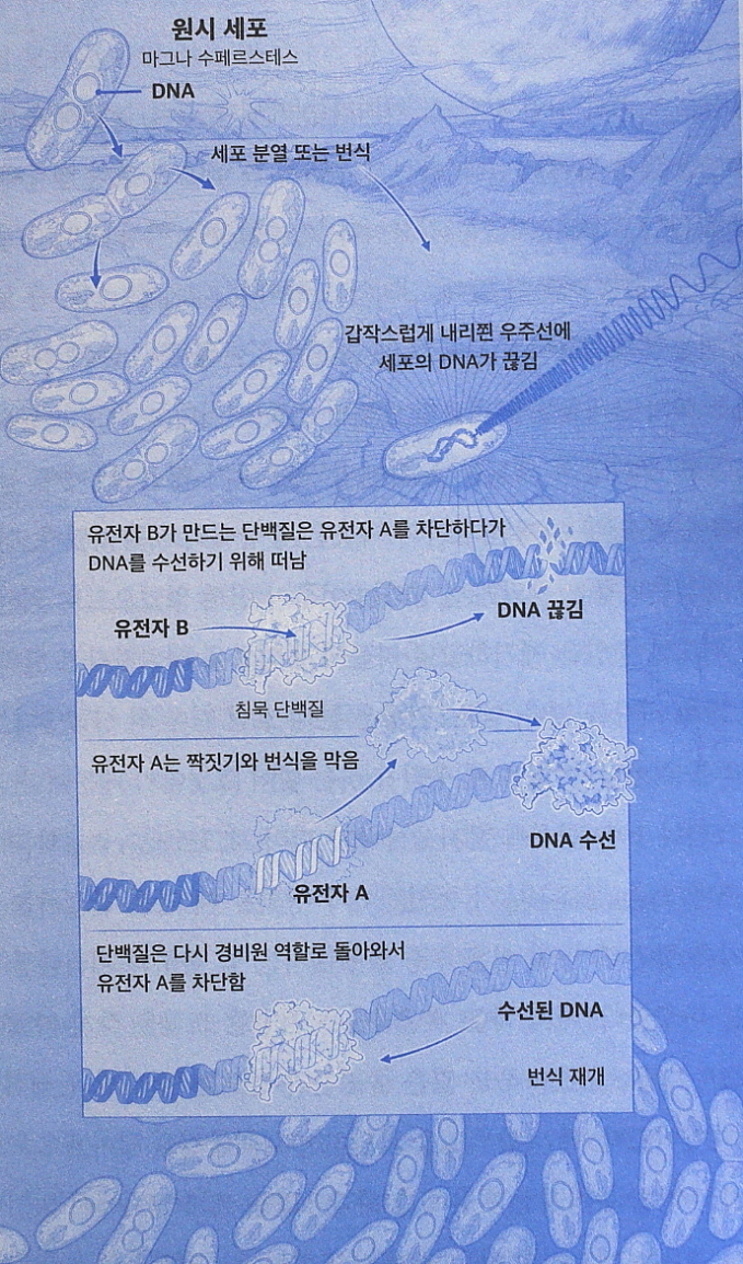 즉 마그나 수페르스테스만 빼고 말이다. 우주선이 대재앙을 일으키고 있을 때 마그나 수페르스테스는 색다른 일을 한다. 단백질 B가 DNA 수선을 돕기 위해 유전자 A로부터 떨어져 나간다. 그 덕분에 유전자 A가 켜지면서 세포는 하고 있던 거의 모든 일을 멈추고 부족한 에너지를 끊긴 DNA를 수선하는 쪽으로 돌린다. 마그나 수페르스테스는 번식하라는 고대로부터 내려온 명령에 반항함으로써 살아남는다.
