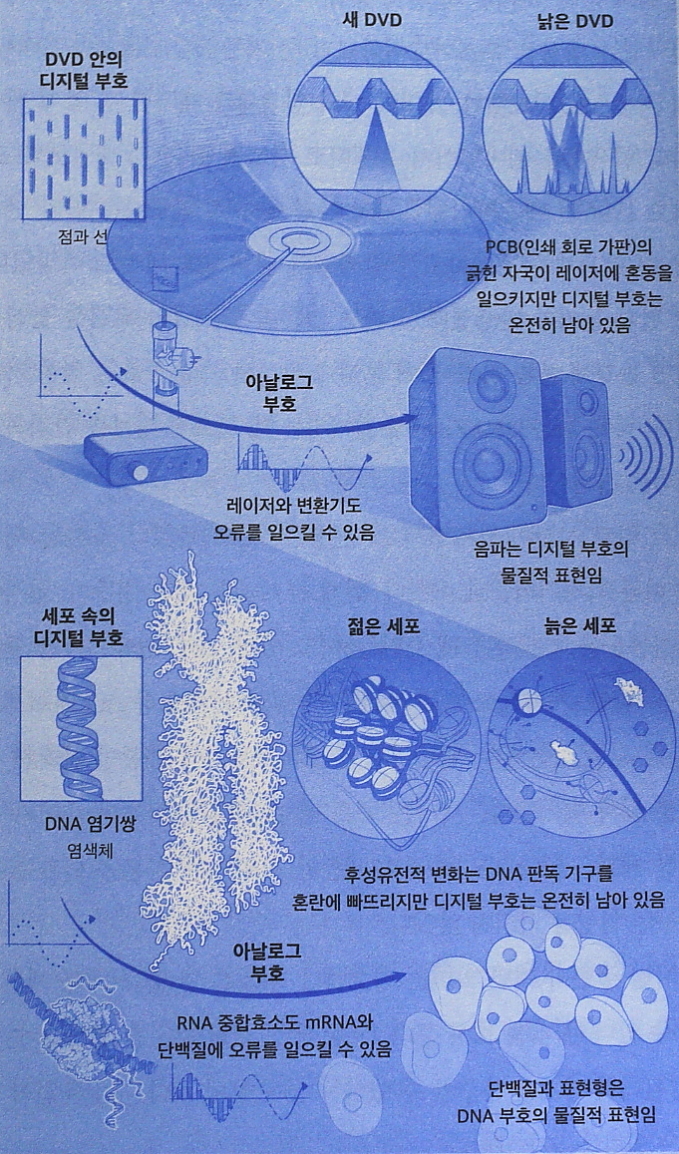 또 DNA는 튼튼하다. 처음 연구실에서 일할 때 나는 이 “생명의 분자”가 끓는 물에서 몇 시간 동안 견딜 수 있다는 사실에 충격을 받았고, 최소 4만년 된 네안데르탈인의 뼈에서 추출할 수 있다는 데 전율을 느꼈다. 이런 디지털 저장의 장점은 왜 핵산 사슬이 40억 년 동안 생물학적 정보 저장의 주된 분자로 쓰였는지를 설명해 준다.
