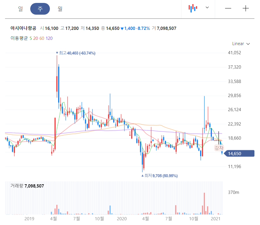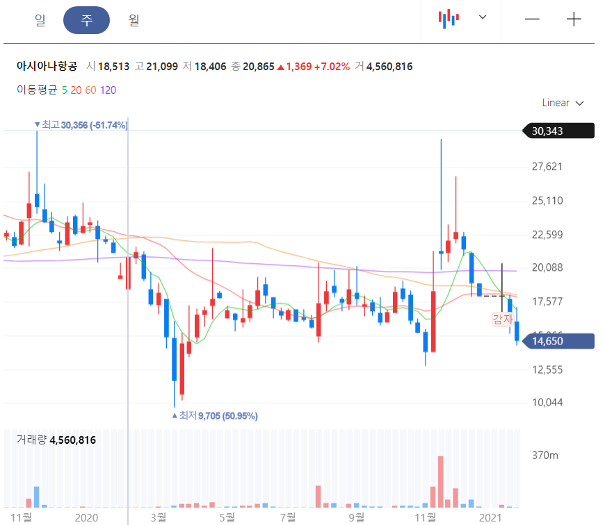 아시아나 항공 무상감자 전후 차트가 달라져 있어서 이를 살펴 보기로 했다.