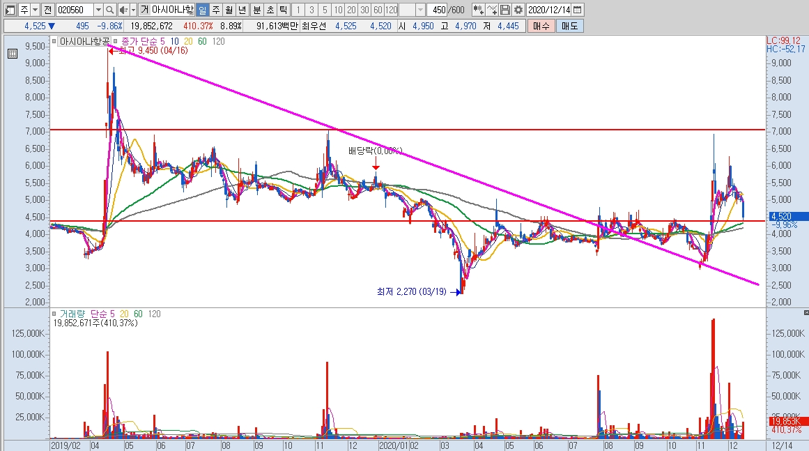 아시아나항공의 주식거래가 정지되기 직전 12월 23일 종가 : 4210원 마감