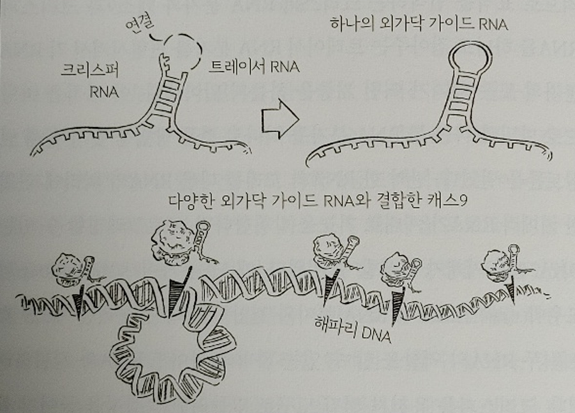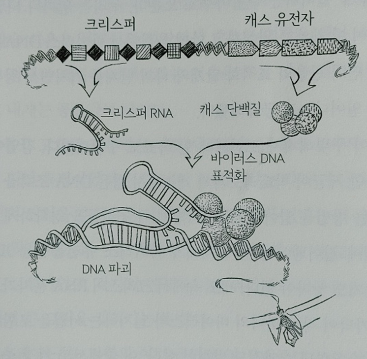 그날 밤. 부엌에서 저녁을 요리하면서 이 작은 기계의 전망을 머릿속에서 그려보았다. 캐스9과 가이드 RNA가 일치하는 DNA 서열을 찾아서 세균 세포를 윙윙거리며 맴돌았다. 문득, 나는 소리 내어 웃었다. 바이러스 DNA를 찾아 파괴하도록 전사 R: 단백질을 프로그래밍할 방법을 만든 세균은 얼마나 놀라운 생명체인가! 다른 목적으로 만들어진 자신을 전혀 다른 목적으로 사용하도록 개조하다니, 이 얼마나 큰 행운이 따라준 기적 같은 일인가. 그 옛날 헵스 교수의 실험실에서 느꼈던 순수한 발견의 기쁨을 누릴 수 있는 귀중한 시간이었다.