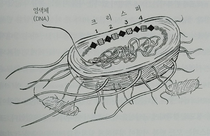 DNA 영역을 표시했다. 바로 이 영역이 크리스퍼였다. 질리언은 마름모를 색칠한 뒤, 이것이 모두 똑같은 30여 개 DNA 염기로 구성된다고 설명했다. 그다음에는 사각형에 숫자를 1부터 써넣고 이 사각형은 독특한 DNA 염기 서열로 구성된다고 설명했다.