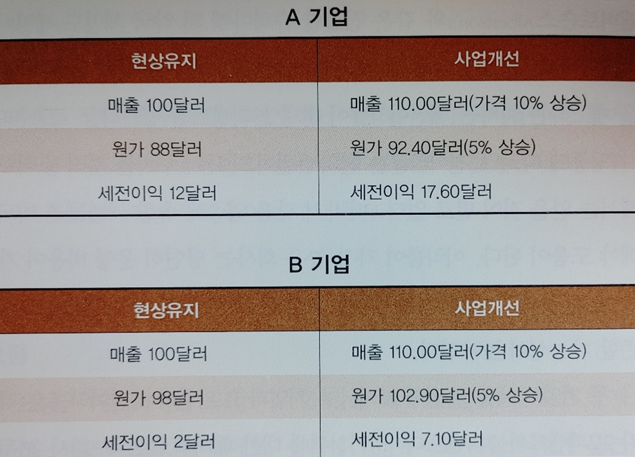 세전이익률은 이해하기 까다로운 면도 있다. 사업 환경이 개선되어 실적이 향상되면, 세전이익률이 가장 낮은 기업이 가장 큰 혜택을 보기 때문이다. 다음과 같이 매출이 100달러인 두 회사의 사례를 생각해 보자.
