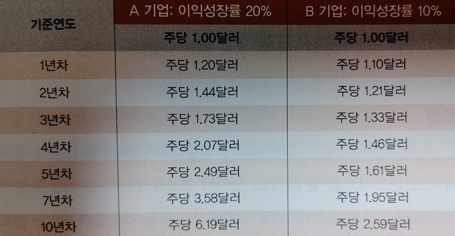 다른 조건이 동일하다면 이익의 20배에 거래되는 성장률 20퍼센트의 기업이 PER 20, 이익의 10배에 거래되는 성장률 10퍼센트의 기업 (PER 10) 보다 훨씬 낫다. 이 말이 난해하게 들릴지도 모르지만, 고성장주의 경우 빠른 이익 증가가 주가를 빠르게 끌어올릴 수 있다는 사실을 분명히 이해해야 한다. 20퍼센트 성장기업과 10퍼센트 성장기업은 주당 1달러부터 동시에 출발한다 하더라도 이익 격차가 급격히 벌어진다.