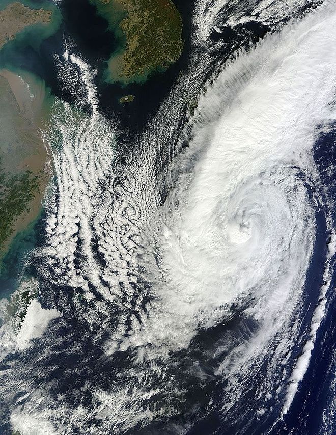 그런데 아래 기상사진에서는 편서풍도 관찰되지만 겨울 철 차가운 시베리아 대륙으로 부터 불어오는 북풍을 확인할 수 있습니다. 북쪽에서 한반도를 지나 바다로 이동하고 있는 기류가 보입니다. 이로인해 제주도의 한라산에 기류가 부딪히고 소용돌이 후류(vortex street)가 생성되는 자연현상을 관찰할 수 있습니다. 그 옛날 대학 다니던 학창시절 유체역학 시간에 배운 폰 카르만 볼텍스(von Karman Vortex)입니다.