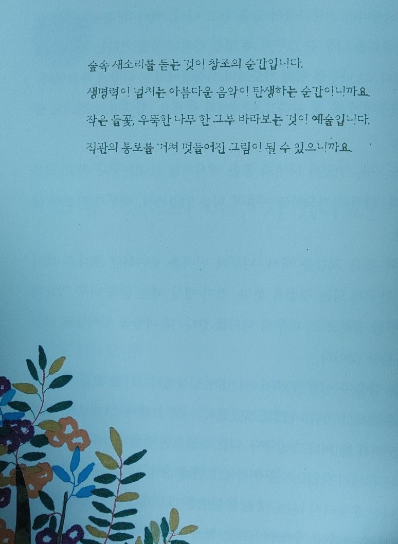 "사람들은 간혹 내게 묻는다. 이런 아름다운 곳에 사니까 정말 행복하겠다고. 정말 보람 있겠다고. 얼마나 좋으냐고 근심걱정이 없겠다고, 얼추 맞는 말이다. 행복하고, 보람 있다. 하지만 '세상에서 가장 평화롭고 행복한 길을 내면서도, 나는 종종 외로워하고, 때로 분노하고, 절망한다. 사랑에 대한 갈증으로 고통스러워한다"