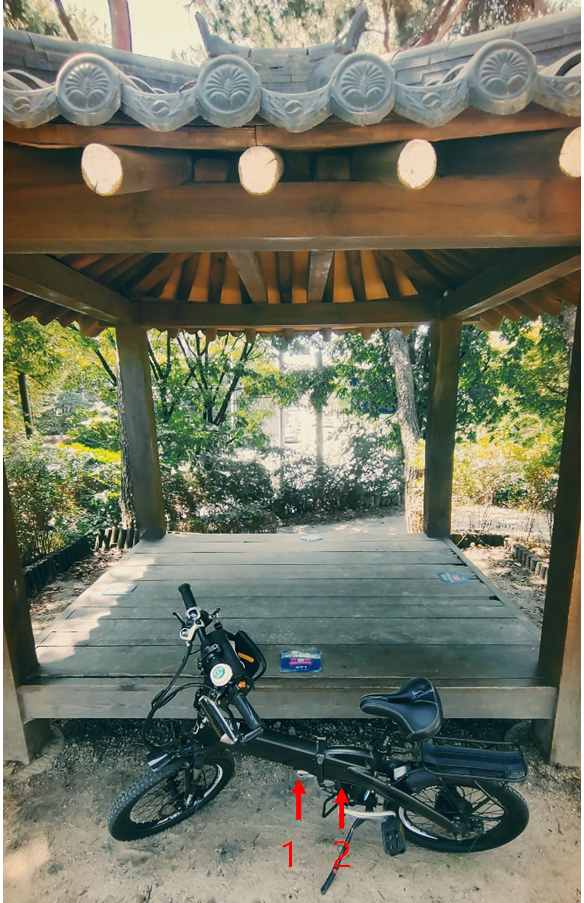 처음에는 아래 사진의 1번 또는 2번 위치로 배터리 연결선을 빼고자 했습니다. 그런데 이때는 자전거 밖으로 커넥터가 연결되기 때문에 방수방진에 취약하겠더라구요. 자전거를 이리저리 보다가 좋은 위치를 발견했습니다.