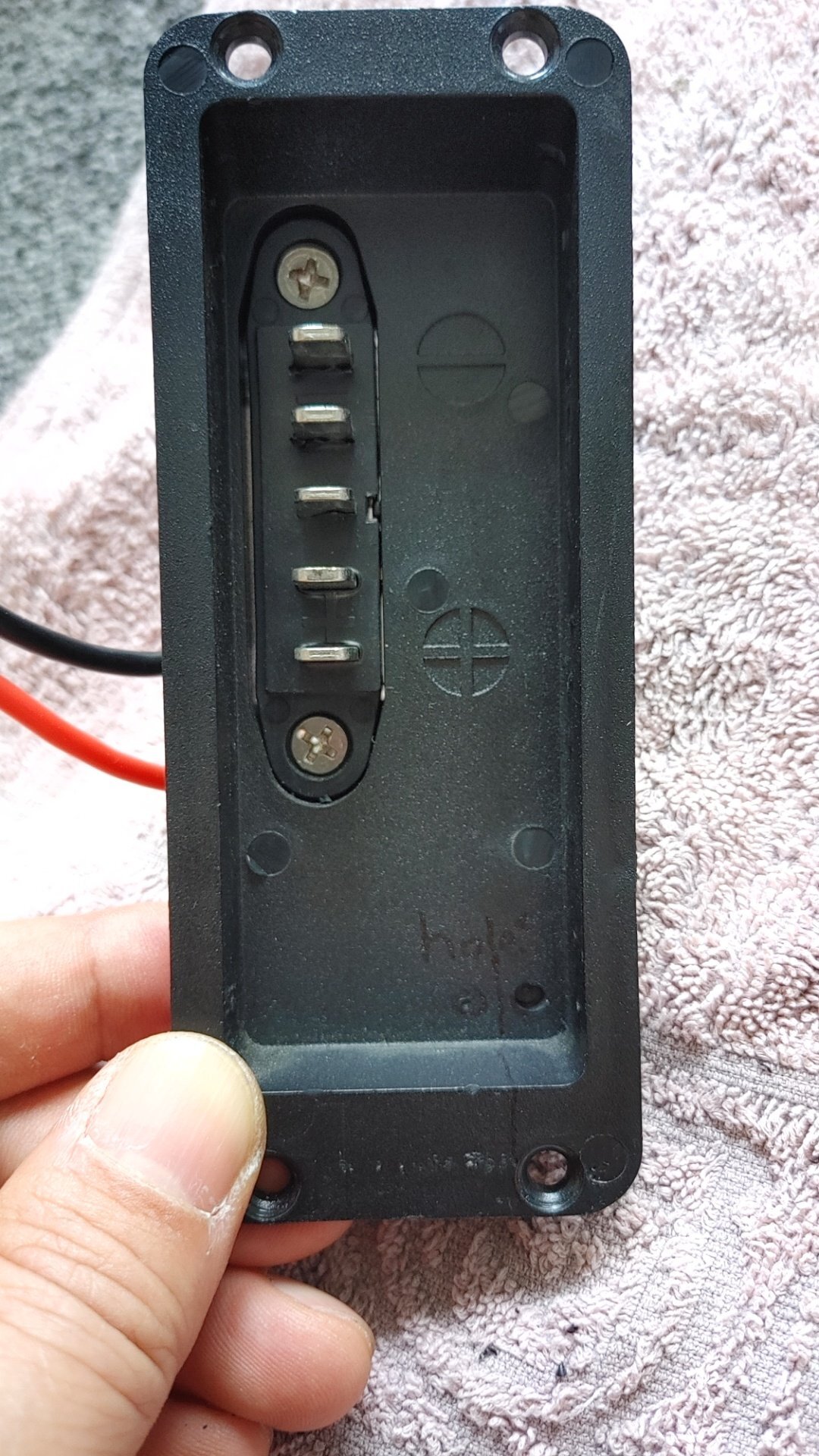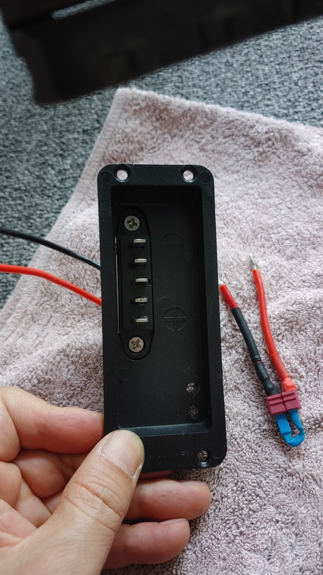 답이 나왔죠. 보조 배터리를 연결할 홀 위치를 표기하고 드릴로 구멍 두개를 뚫습니다. 그리고 그 쪽으로 사진 뒤에 보이는 빨간색과 검은색 선에 연결하면 되는 것입니다. 하하~