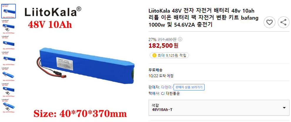 여섯 가지 조건을 만족하는 배터리를 찾기위해 전기자전거 카페를 약 3일간 검색하고, 업체분석을 한후 구입하고자 하는 배터리를 찾게 되었습니다. 가장 중점을 둔것은 기존 자전거 배터리 슬롯에 들어가는 것과, 용량이 동일한 48V 10ah가 가짜 제원이 아닌 것을 찾는데 주안점을 뒀습니다.