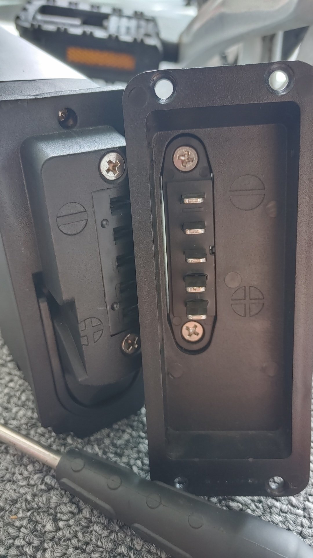 자전거를 접으면 배터리 쪽과 컨터롤러 쪽으로 나누어지는 것을 확인할 수 있습니다. 마침 + 단자 아래에 자전거를 접어도 형성되는 빈공간을 발견하였습니다. -대박~