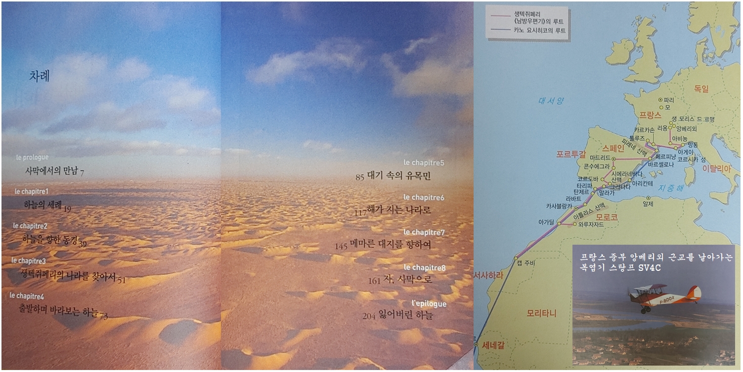 생텍쥐페리는 <어린왕자>의 무대로 사막을 택했던 것이다. 이 이야기를 쓰기까지 생텍쥐페리는 하늘을 날고 하늘을 경작하면서, 인간의 역사와 자신의 성장을 응시해갔다.