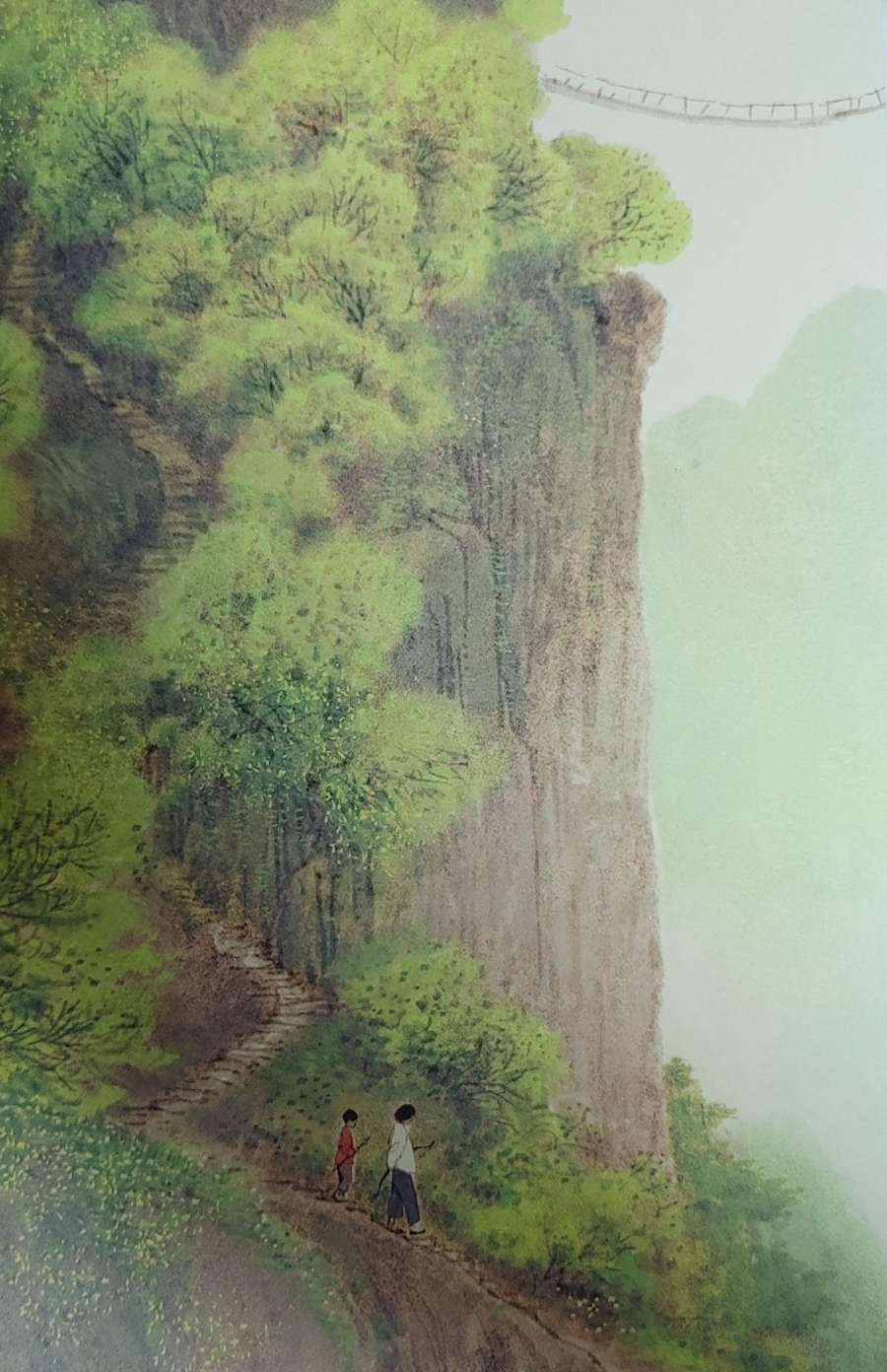 겁에 질린 이방인은 닳아빠진 다리 가운데로 갔다가 발밑의 까마득한 낭떠러지를 보고 그대로 얼어붙었다. 그는 아까와 똑같은 자세와 동작으로 복숭아 나무를 향해 화살을 날렸으나 멀리 빗나갔다.