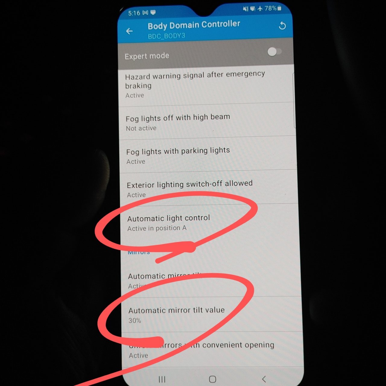 {Body Domain Controller -> Automatic mirror tilt value -> 40%}