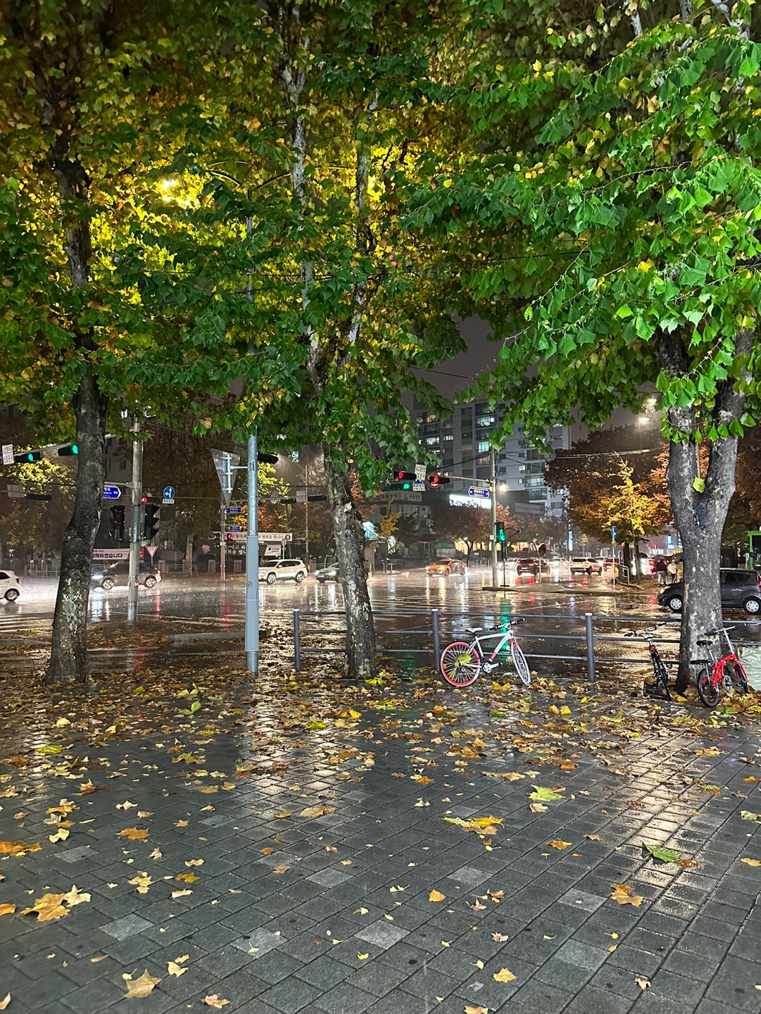 (위험 콤보 : 빗길 + 낙엽 + 내리막 경사)