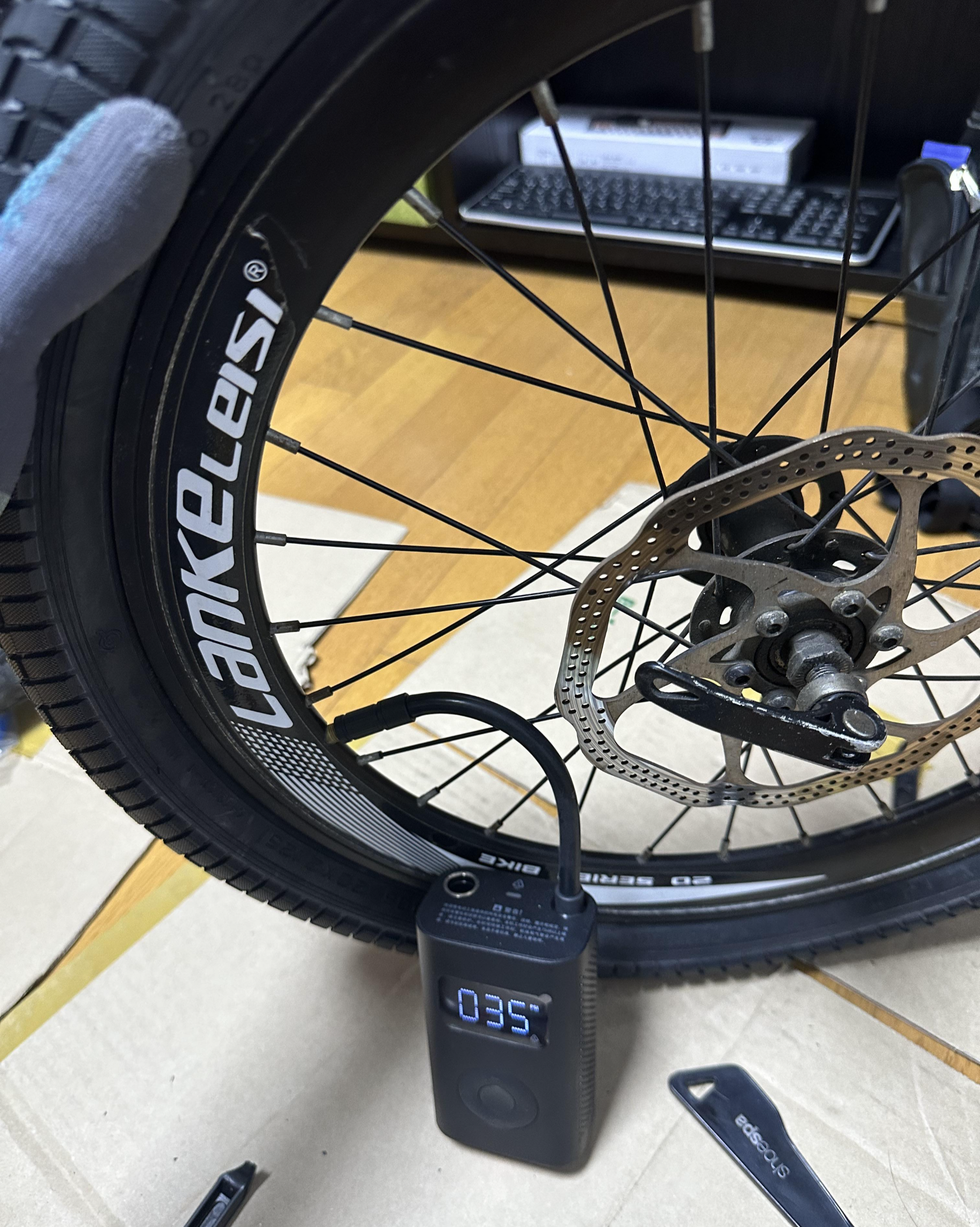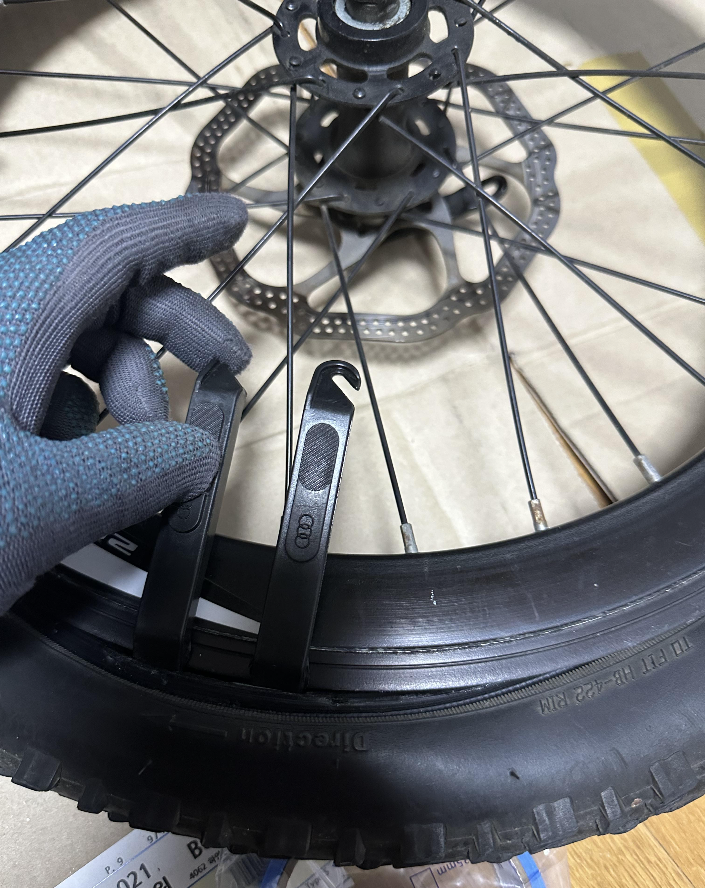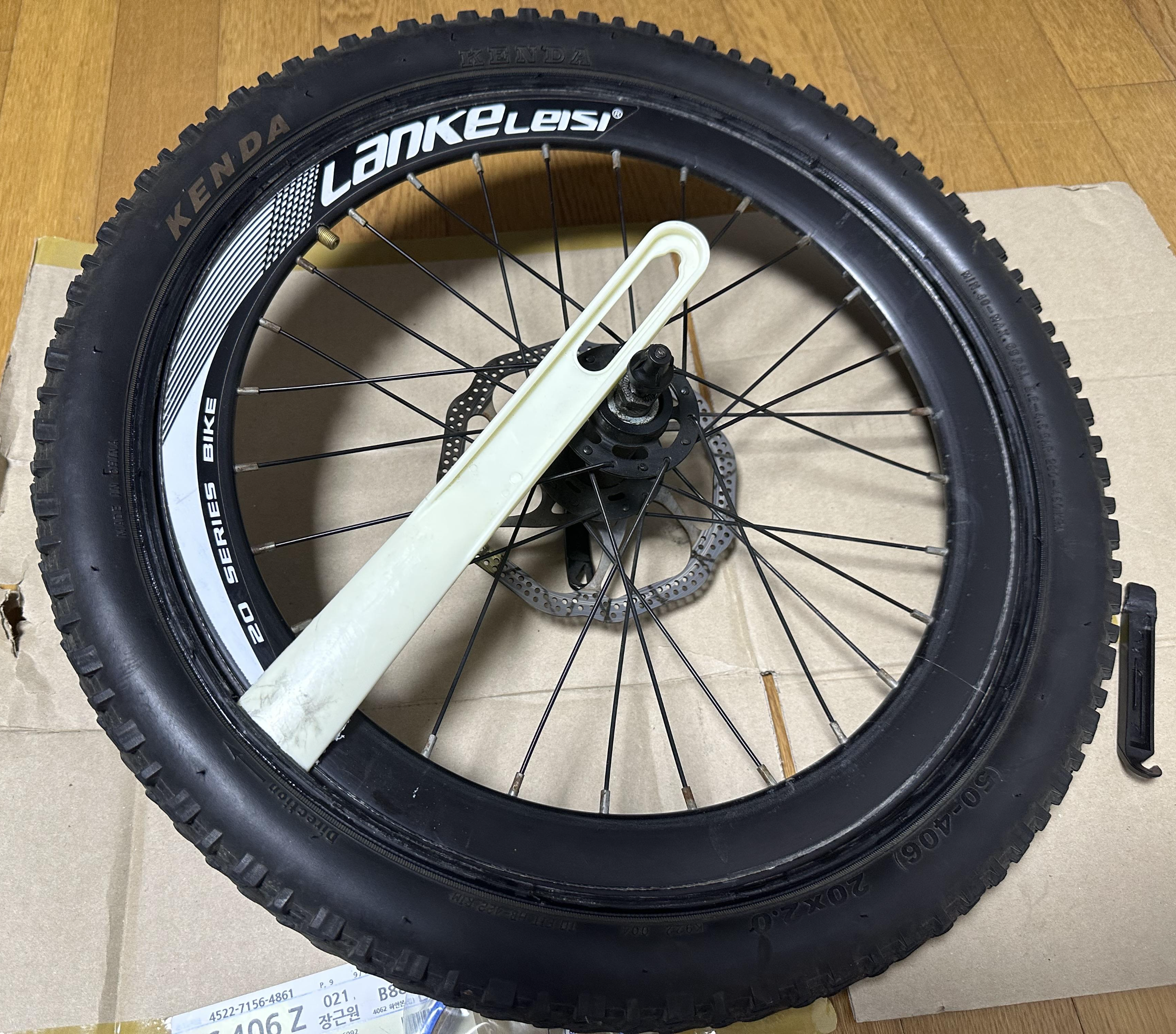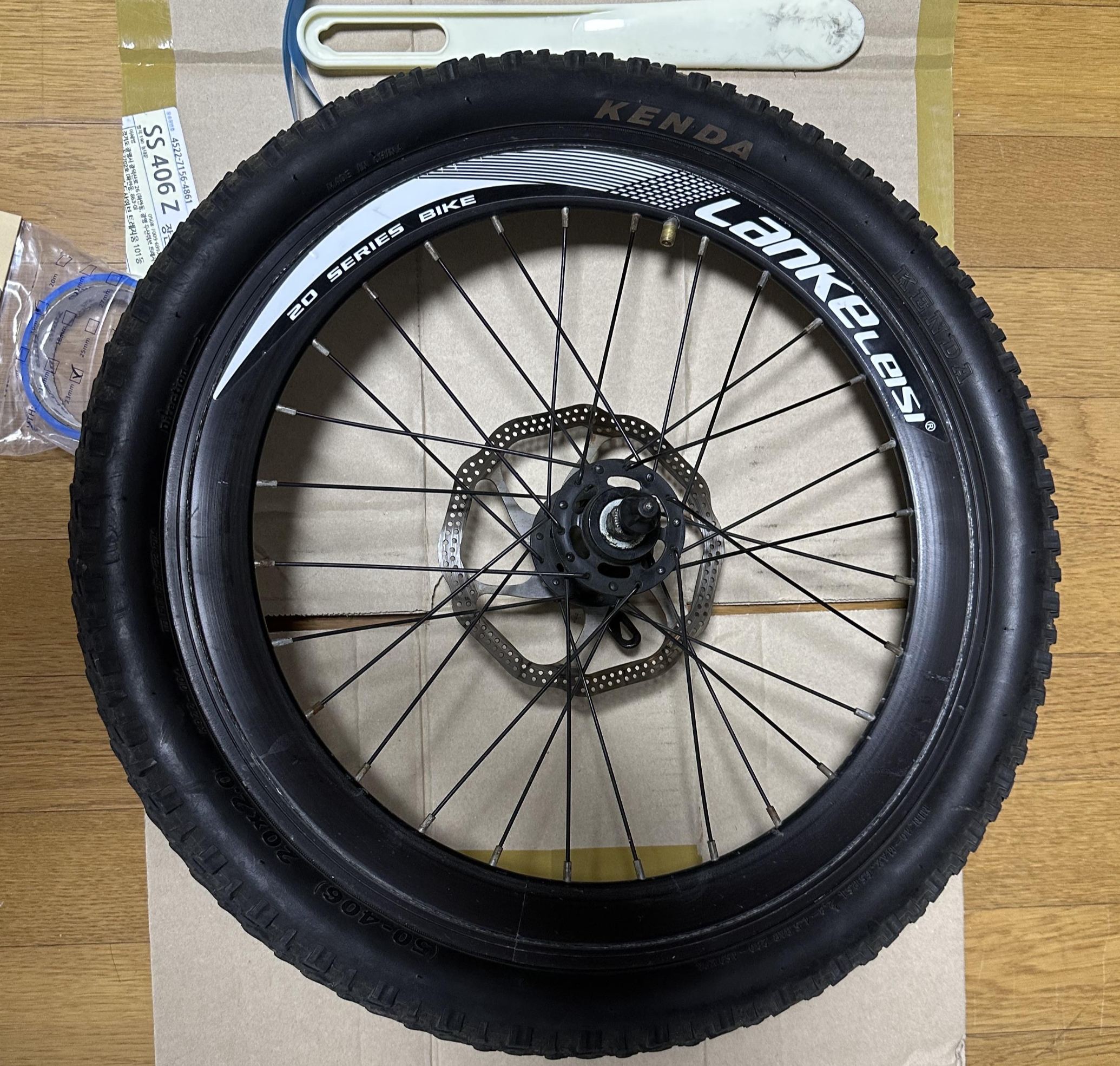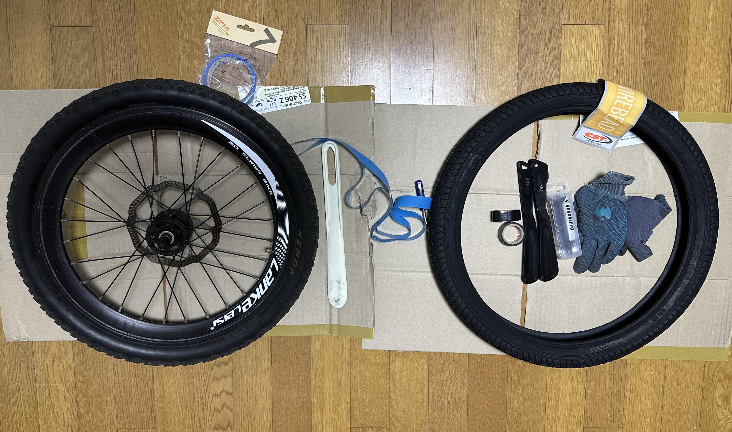 ■ 준비물 : 새 타이어(20x2.125), 타이어 분리 공구(주걱, 펑크 키트에 포함된 막대기, 장갑, 림 테이프)