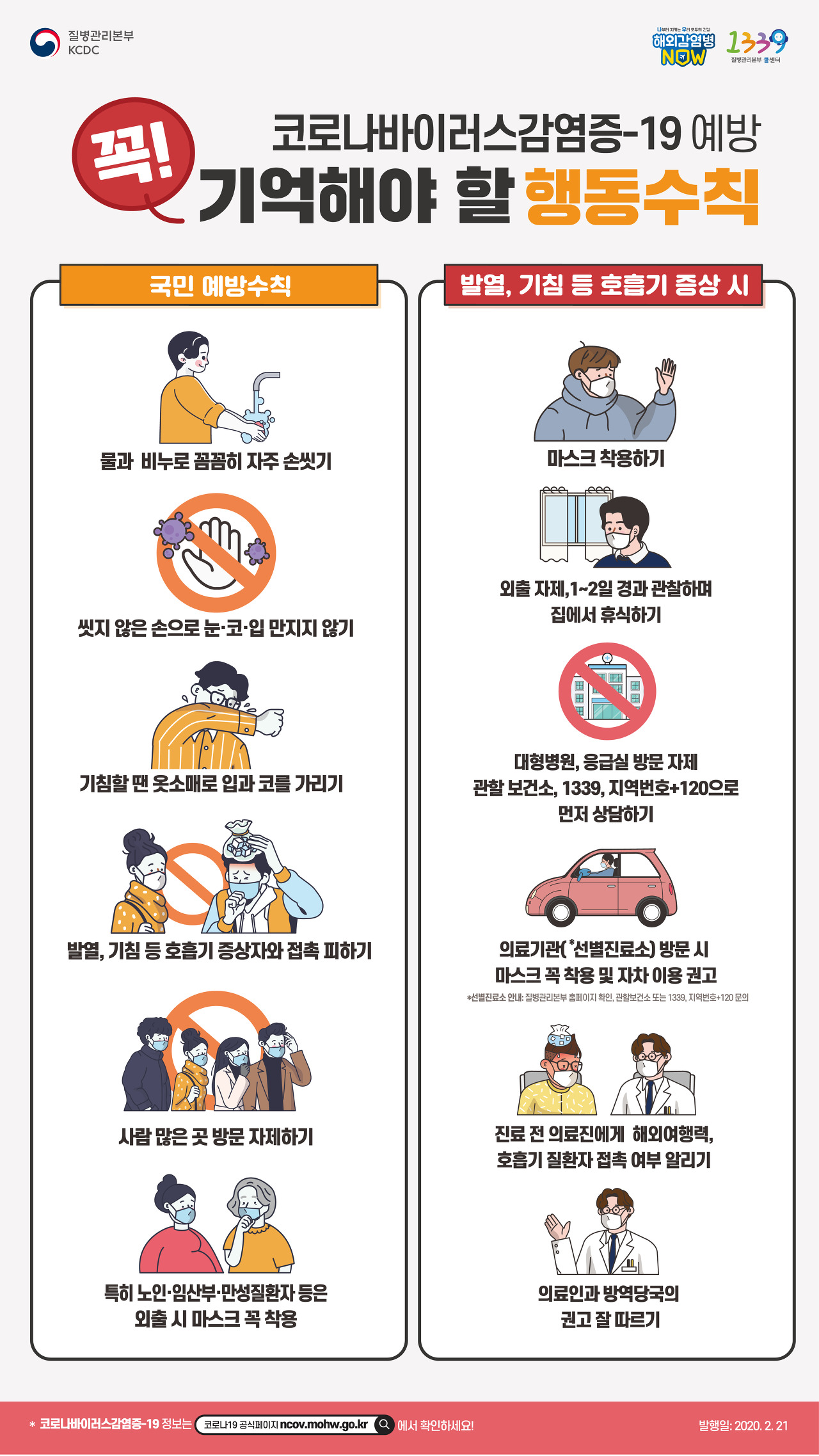 질병관리본부에 따르면 발병 진원지인 중국 우한을 방문할 경우 현지 야생동물과의 접촉을 피하는 것은 물론 감염 위험이 있는 시장과 의료기관 방문, 발열·호흡곤란 등의 증상이 있는 사람과의 접촉을 피해야 한다. 또 중국 우한을 방문한 사람은 귀국 뒤 14일 내에 관련 증상이 나타날 경우 질병관리본부 콜센터(☎1339)나 보건소로 연락해야 한다.