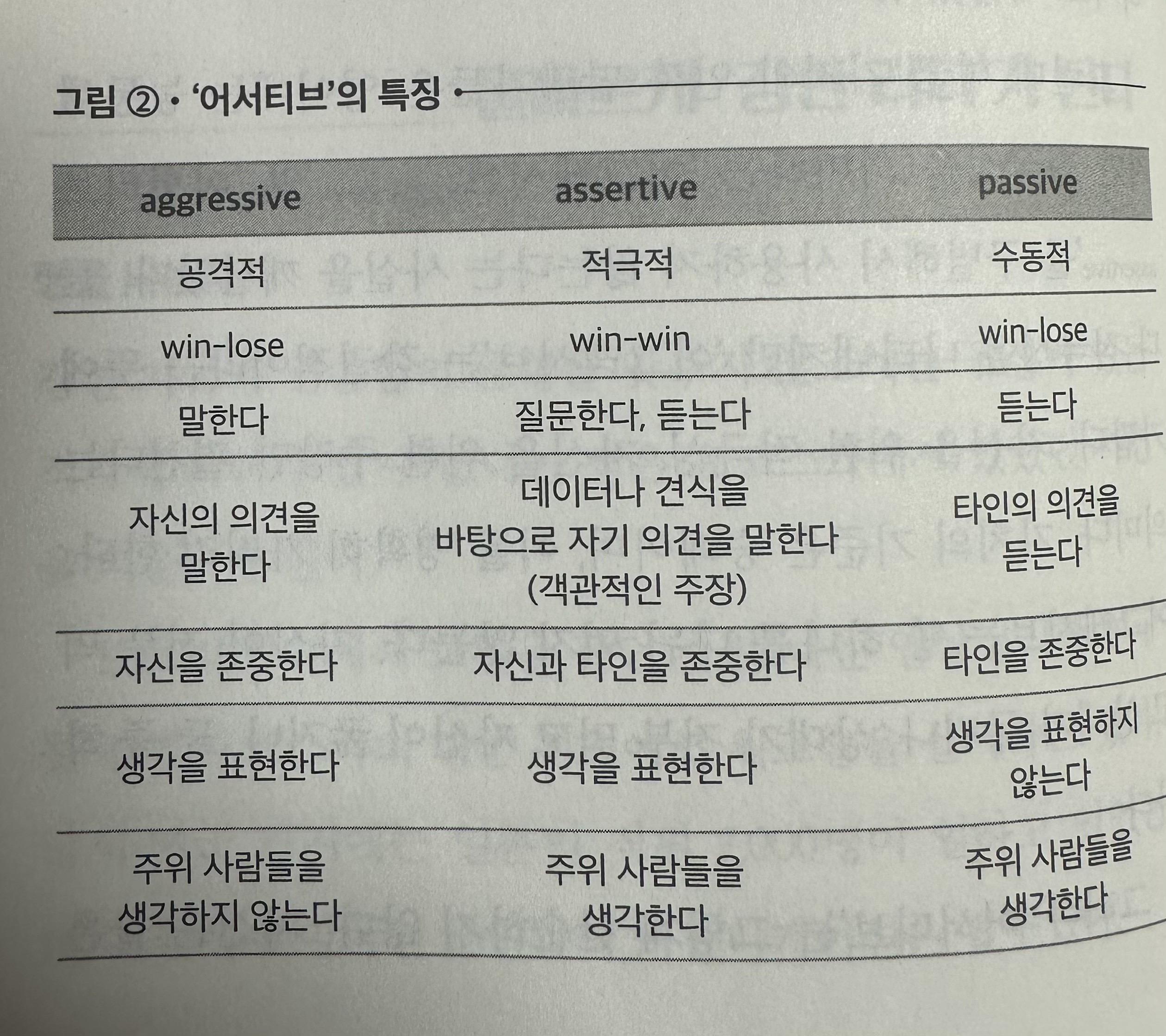 그러나 '어서티브'는 그렇게 단순하지 않다. 자신은 물론 상대도 고려하면서 적극적으로 주장해 윈윈을 지향한다. 그러려면 '패시브 passive(소극적) 이상 어그레시브 미만'이라는 상태여야 한다.