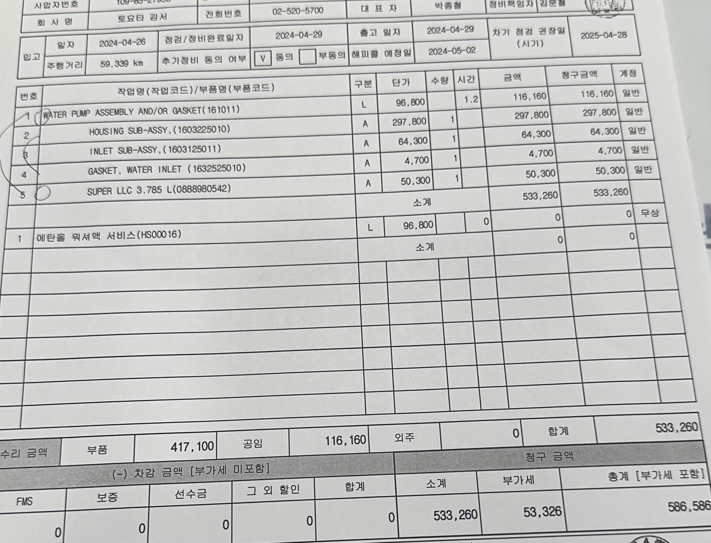 다음날 체크 엔진 뜬 상태로 출근을 한 후 퇴근길에 보험사 견인 서비스를 불러 도요타 서비스에 차를 보냈습니다. 그다음 날 서비스 센터에서 연락이 왔는데 결론적으로 워터 펌프 고착되어 평소 펌핑의 약 40%의 냉각수만 순환되고 있었다고 합니다.