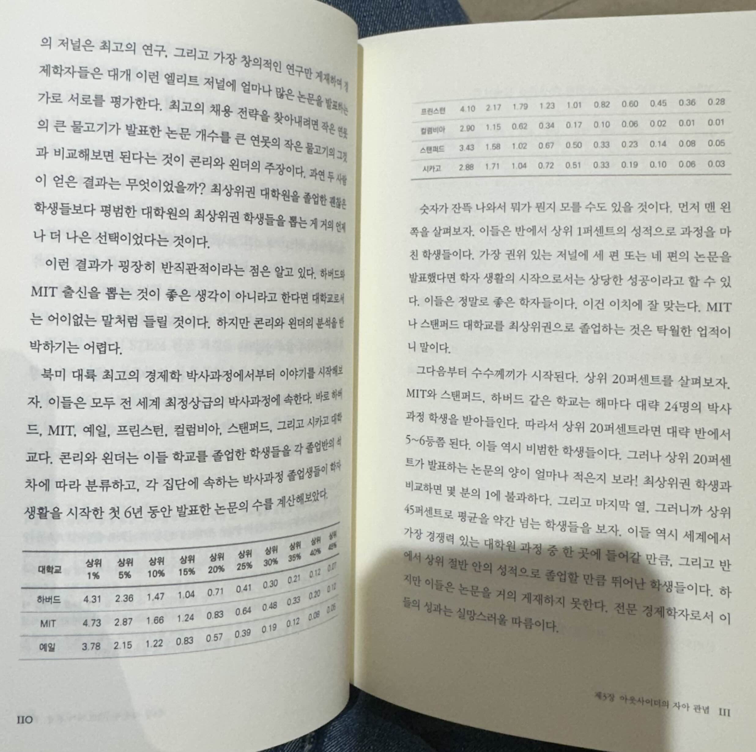그다음부터 수수께끼가 시작된다. 상위 20퍼센트를 살펴보자. MIT와 스탠퍼드, 하버드 같은 학교는 해마다 대략 24명의 박사 과정 학생을 받아들인다. 따라서 상위 20퍼센트라면 대략 반에서 5~6등쯤 된다. 이들 역시 비범한 학생들이다. 그러나 상위 20퍼센트가 발표하는 논문의 양이 얼마나 적은지 보라! 최상위권 학생과 비교하면 몇 분의 1에 불과하다. 그리고 마지막 열, 그러니까 상위 45퍼센트로 평균을 약간 넘는 학생들을 보자. 이들 역시 세계에서 가장 경쟁력 있는 대학원 과정 중 한 곳에 들어갈 만큼, 그리고 반 에서 상위 절반 안의 성적으로 졸업할 만큼 뛰어난 학생들이다. 하 지만 이들은 논문을 거의 게재하지 못한다. 전문 경제학자로서 이 들의 성과는 실망스러울 따름이다.
