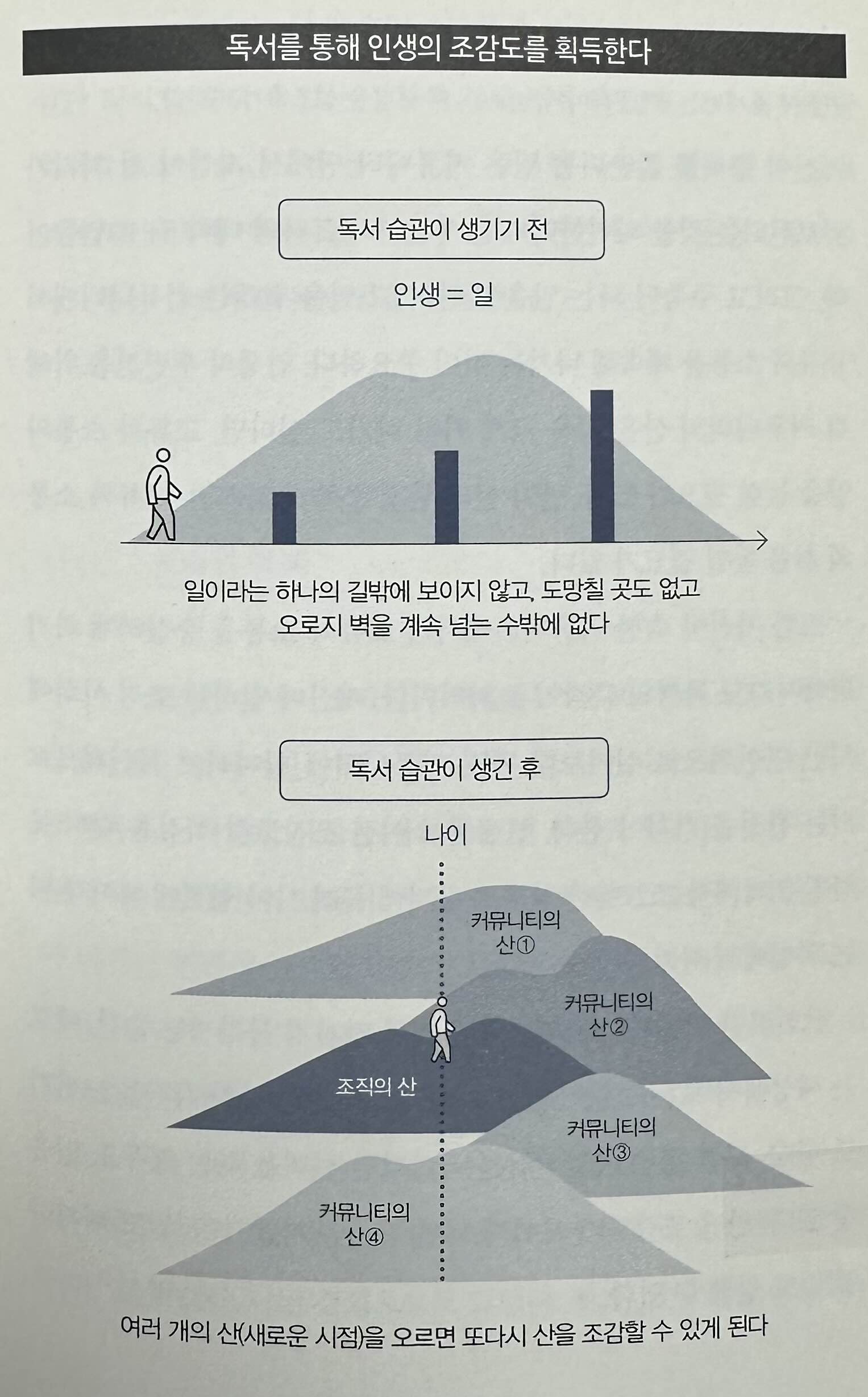 하지만 인생 후반에 여러 개의 산을 오르락내리락할 생각이라면 일을 통해 오른 가장 중점이 되는 산과는 다른 산을 인생의 전반이나 중반부터 만들어 둬야 한다. 그 산을 구축하기 위해 25세에서 55세 까지의 30년간 조직에서 일하는 주축과 달리 왼쪽에 두 개, 오른쪽에 두 개 정도 각기 다른 커뮤니티에 자신이 설 자리를 만들어 두는 것이 필요하다.