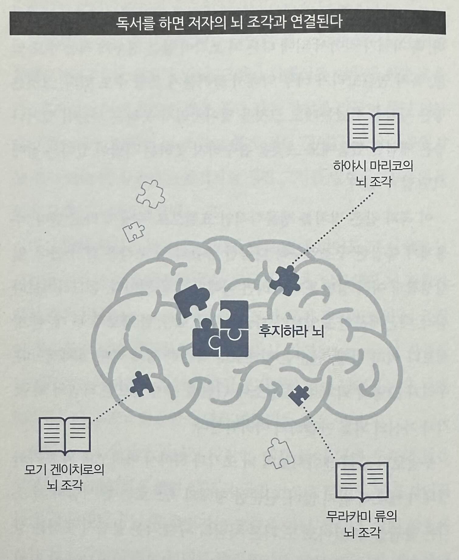 다시 말해 독서는 책을 쓴 사람이 바로 곁에 없어도 그 사람의 뇌 조각을 자신의 뇌에 연결해 주는 도구가 된다. 이를테면 뇌 과학자 모기 겐이치로茂木健一郎의 작품을 읽으면 모기 겐이치로의 뇌 조각 이 후지하라 뇌에 달라붙고, 작가 하야시 마리코林真理子의 작품을 읽으면 하야시 마리코의 뇌 조각이 후지하라 뇌에 달라붙는다. 뇌에 달라붙는다고 해도 깔끔한 형태로 연결되는 것은 아니다.