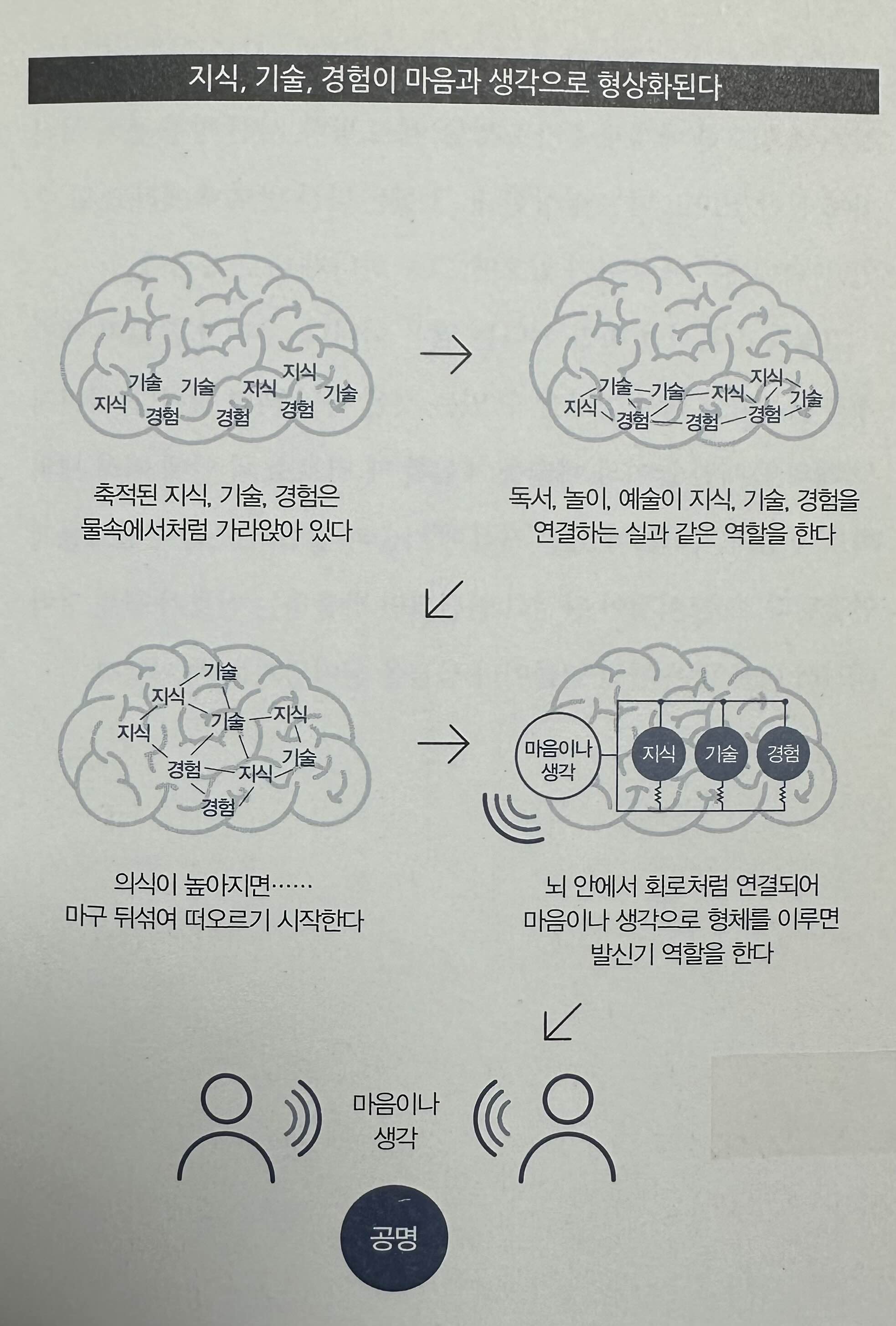 인간이 살면서 축적한 지식, 기술, 경험의 모든 것은 뇌의 어딘가에 가라앉아 있다가 어떤 의식이 강해지면 마구 뒤섞여 떠오르기 시작한다. 그렇게 떠오르기 시작할 때 순식간에 연결돼 회로를 형성하는데, 인간은 그것을 마음이나 생각의 형태로 품게 된다. 거꾸로 말하면 지식, 기술, 경험이 수면 위로 떠오르지 않으면 마음이나 생각 은 생겨나지 않는다.