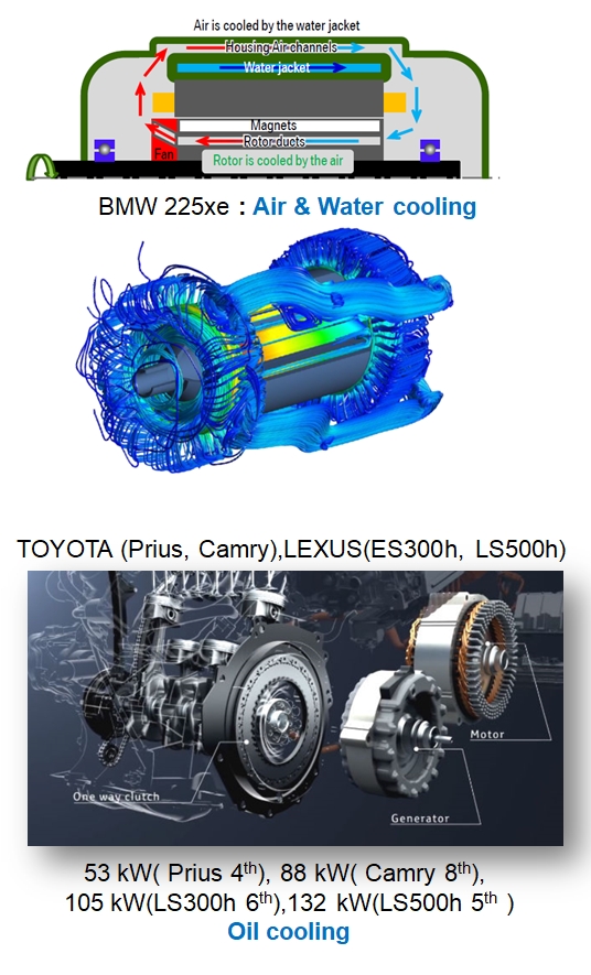 네 번째가 BMW 차량(225e)에 장착되는 모터로서 수냉과 공냉을 조합한 수공냉 복합냉각방식을 취하고 있는데, 그림을 자세히 보시면 내부에 공기를 강제 순환하는 루트가 있고, 하우징 외곽에 물이 흐를 수 있는 유로도 있습니다.