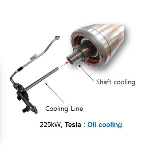 마지막으로 테슬라의 전기 모터입니다. 오일냉각에 더해 모터 내부에 회전하는 로터의 축으로 오일을 이송하는 냉각장치를 추가하여 냉각성능 향상을 추가하고 있습니다. 테슬라는 냉각하는 방법도 뭔가 좀 달라보이네요. 모터를 냉각하는 방식도 앨론머스크 스럽네요.