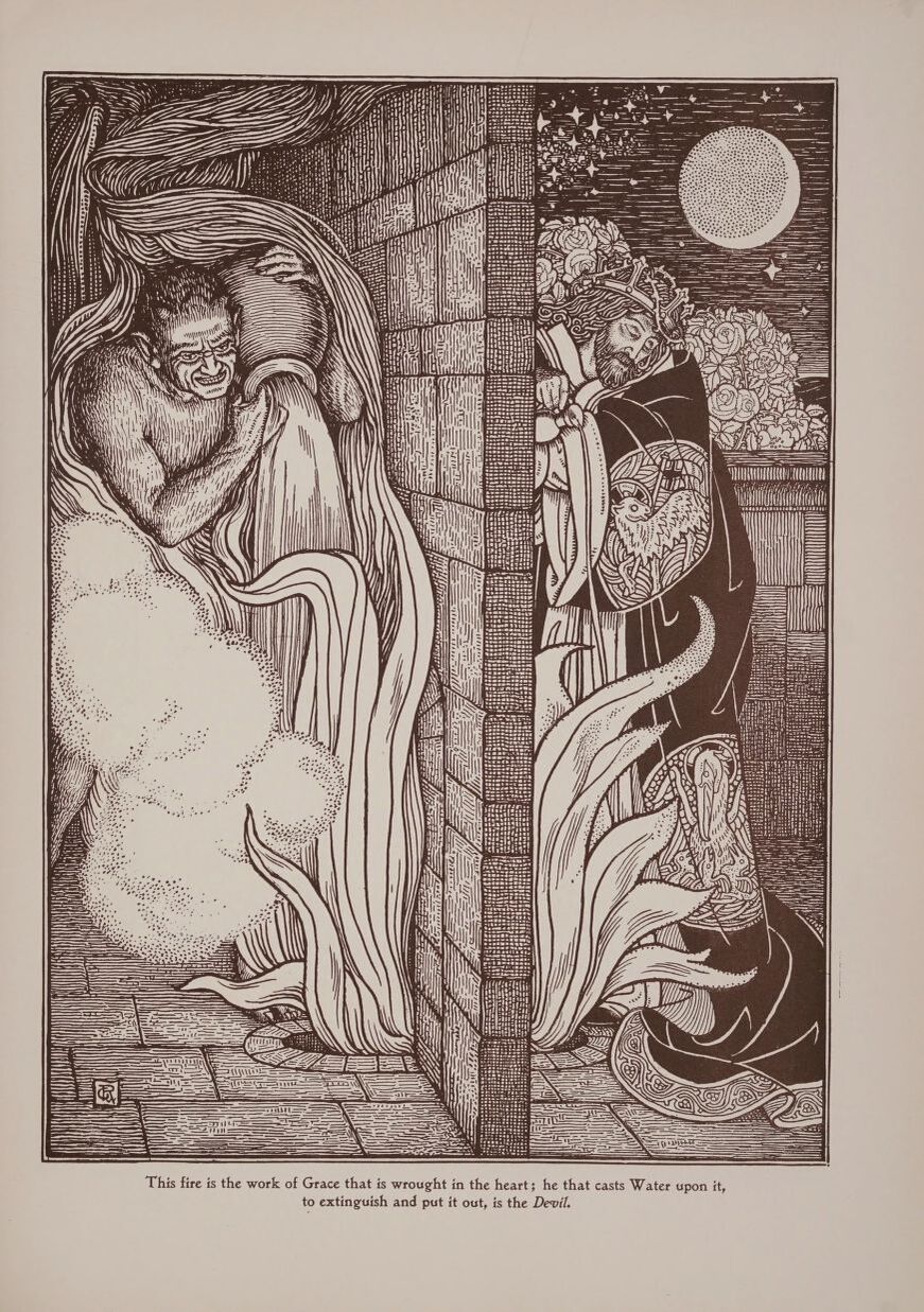 꿈속에서 보니 해석자는 크리스천의 손을 잡고 또 다른 방으로 들어가는 것이었다. 그곳의 한쪽 벽난로에는 불이 활활 타오르고 있었다. 한 사람이 벽난로 옆에 서서 그 불길을 끄기 위해 많은 물을 끼얹고 있었으나 불은 꺼지기는커녕 점점 더 높이 그리고 더 뜨겁게 타오르는 것이었다.