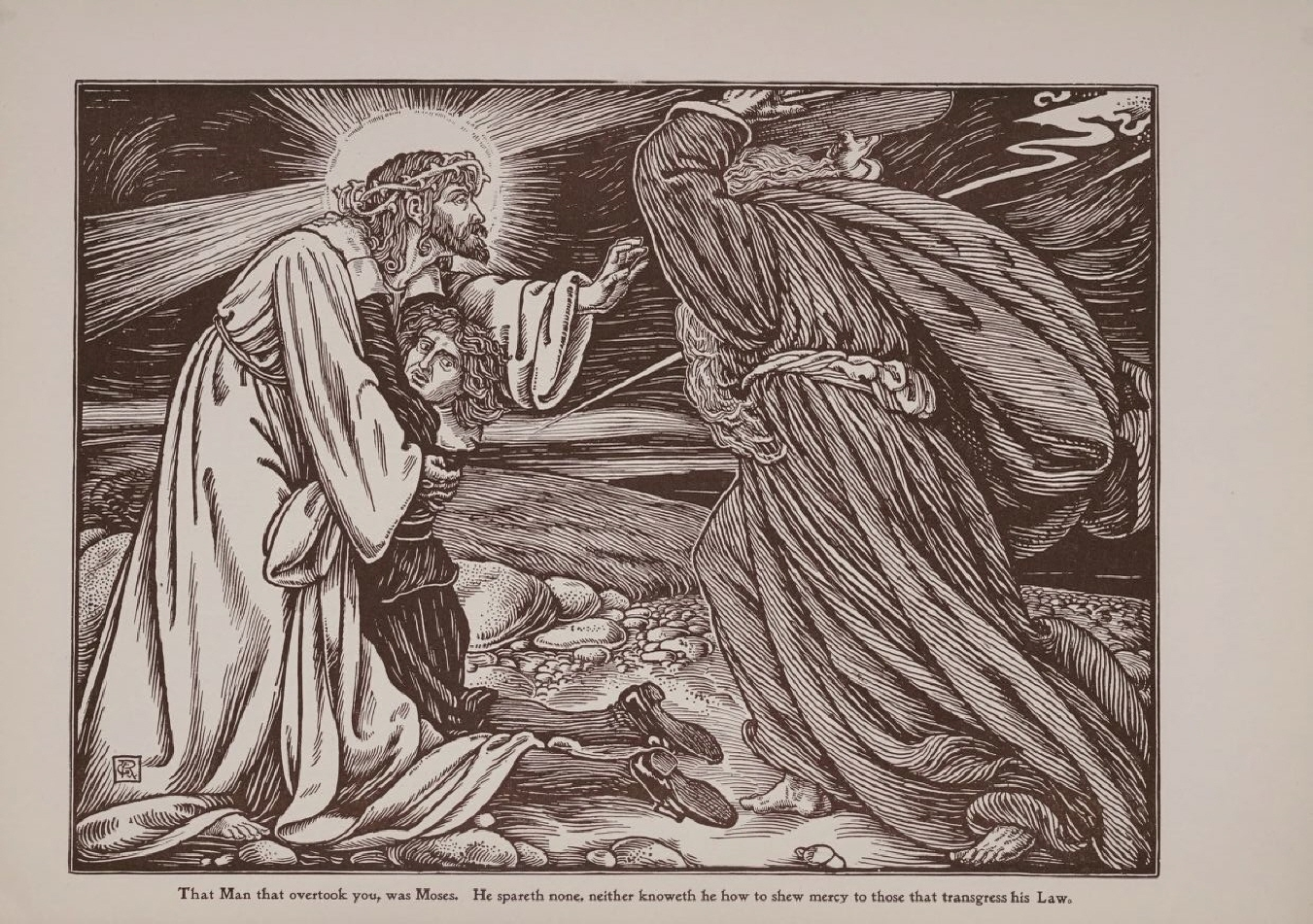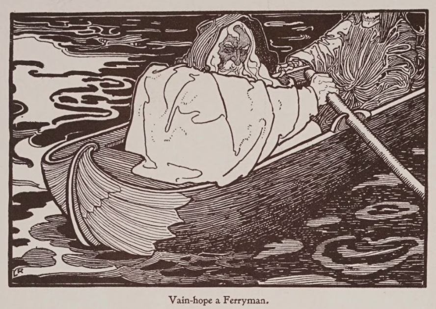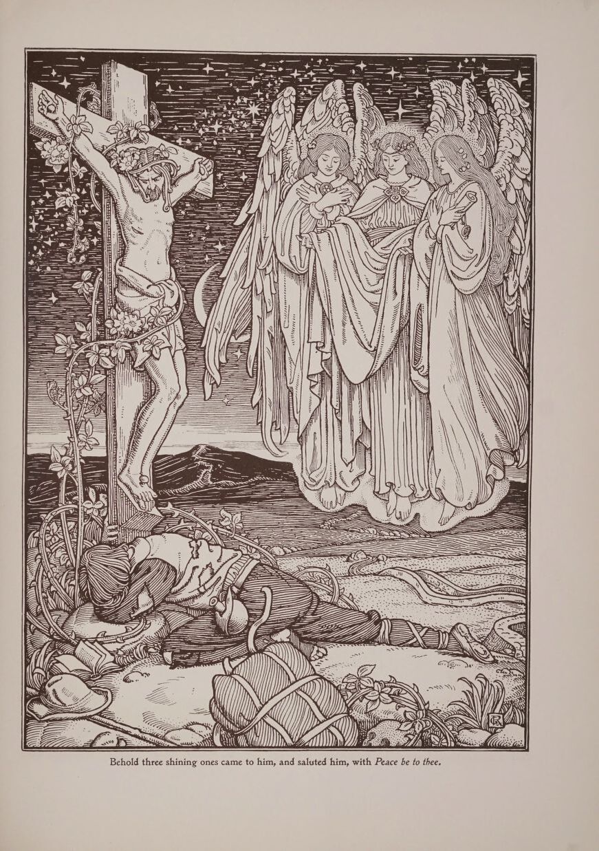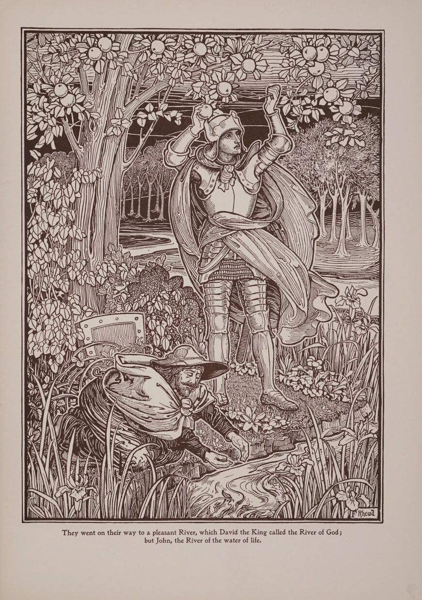 p 251 순례자들이 강을 건너다. - 건너편 강둑에 올라섰을 때, 그들은 다시 두 명의 빛나는 사람들이 기다리고 있는 것을 보았다. " 우리는 섬기는 영으로서 구원받을 상속자들을 섬기라고 보내심 받은 자들입니다." (히:1:14)