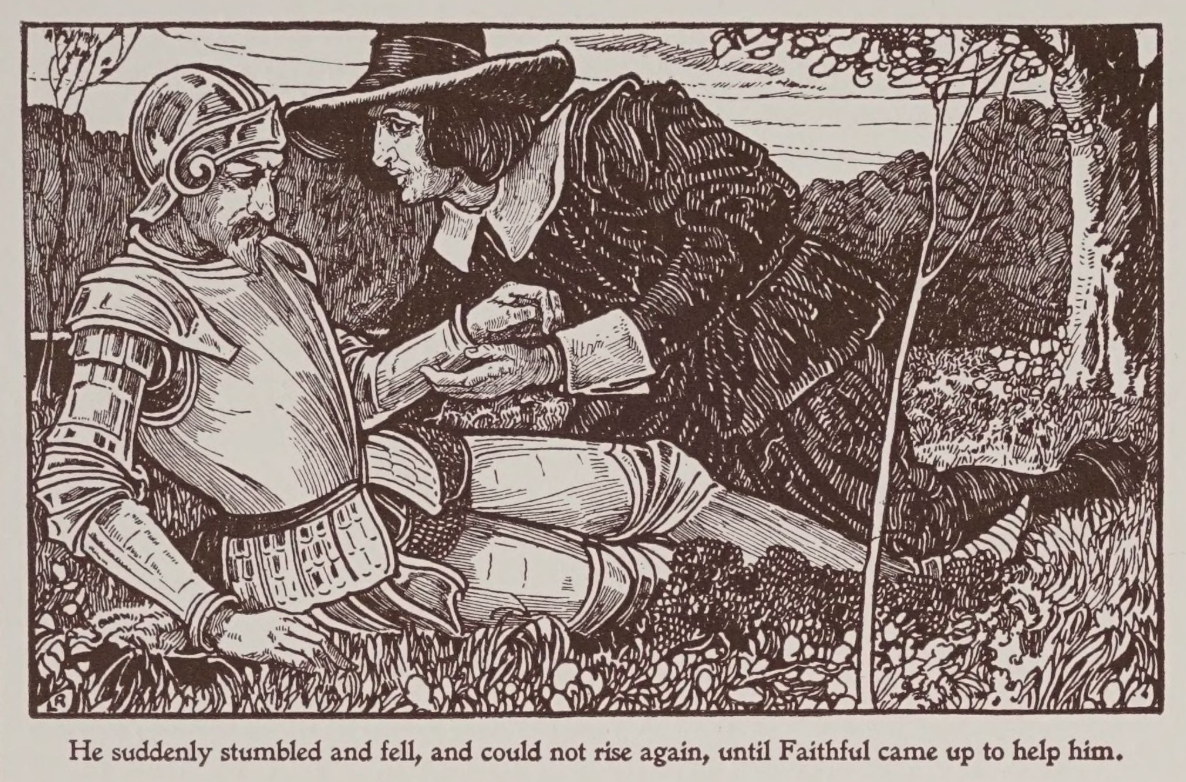 이상하게도 얼마 뒤에 만난 친구 ‘믿음(Faithful)’이는 이 ‘굴욕의 골짜기’에서 아불루온과의 전투를 치루지 않는데, 이런 일은, 바로 크리스챤의 아내 크리스티아나와 그의 자녀들의 경우에도 마찬가지다. 모든 신자들, 순례자들이, 이런 험한 영적 전투를 치루지 않는다는 것을 보여준다.