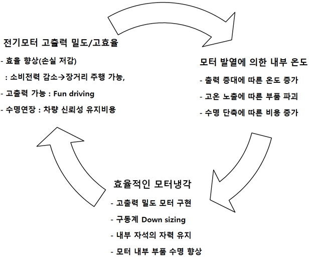 모터 설계에 있어서 효율적인 모터냉각의 필요성을 아래 그림에 도시하였습니다. 표시된 내용과 같이 발열에 대한 효율적인 냉각을 수행할 수 있다면 효과적인 모터 설계의 선 순환을 이루어 낼 수 있습니다.
