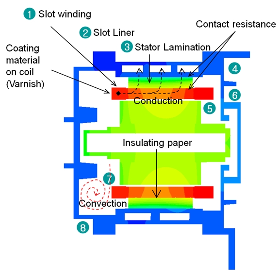 그림에 표시된 열의 분포(전도와 대류에 의한 이동)와 같이 코일 부에 발생된 열은 코일을 감싸고 있는 절연지의 열 저항을 통과한 후 스테이터를 지나 냉각수가 흐르고 있는 하우징을 통해 외부로 이동합니다.