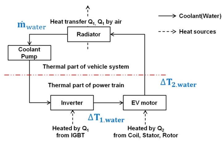 그림에서 보여주는 모터의 열 생성 상황을 설명하면 인버터의 스위칭 소자 IGBT(insulated-gate bipolar transistor)를 통한 전원이 모터에 인가되면 모터에 감긴 코일에 전류가 흐르고 이 때 전류의 제곱과 저항의 곱으로 코일에서 동 손실(copper loss)에 의한 열이 발생하며, 로터와 스테이터에는 철 손실(iron loss)에 의한 열도 발생합니다.