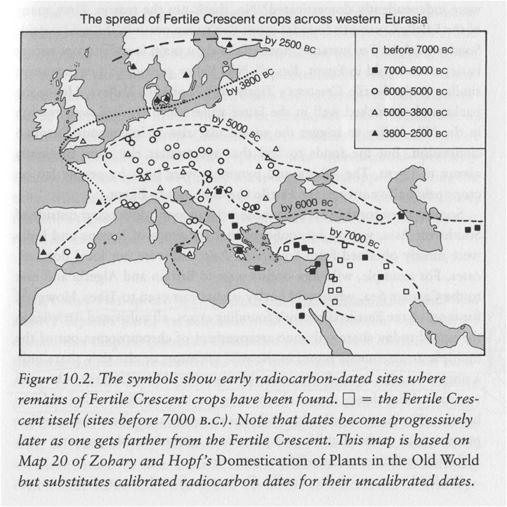 이렇게 야생 조상종이 대륙마다 매우 고르지 않게 분포되어 있었다는 사실은, 다른 대륙이 아니라 유라시아 사람들이 총기, 병원균, 쇠를 갖게 된 중요한 원인이기도 했다. 그렇다면 고대 14종이 유라시아에 집중된 이유는 어떻게 설명해야 할까? 그것은 유라시아가 세계에서 가장 넓은 땅덩어리이기 때문이다. 또한 생태학적으로도 매우 다양해서 광활한 열대우림은 물론이고, 온대림, 사막, 소택지, 그리고 역시 광활한 툰드라 지대에 이르는 각양각색의 생식지가 있기 때문이다.