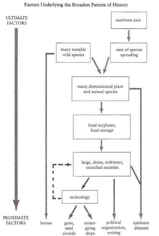 이상에서 본 것처럼 정복의 궁극적 원인은 식량 생산과 사회 사이의 경쟁 및 확산이었다. 거기서 시작된 인과 관계의 사슬에 의해 병원균, 문자, 기술, 중앙 집권적 정치 조직 등 정복의 직접적 원인이 생겨나게 된 것이다. 구체적 인과 관계는 경우에 따라 달랐지만 언제나 공통적인 요소는 조밀한 대규모 인구와 정주형 생활이었다.