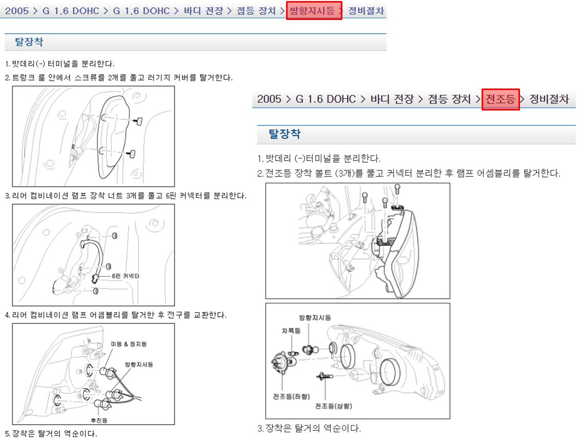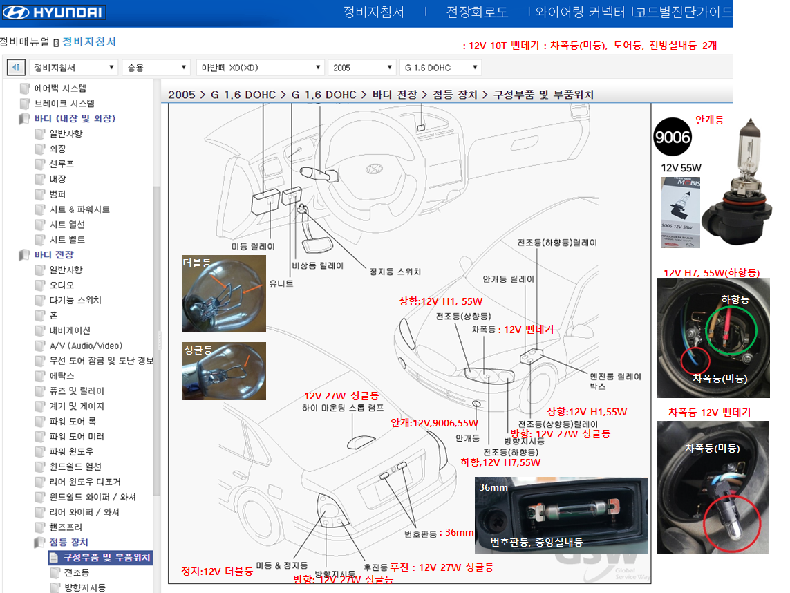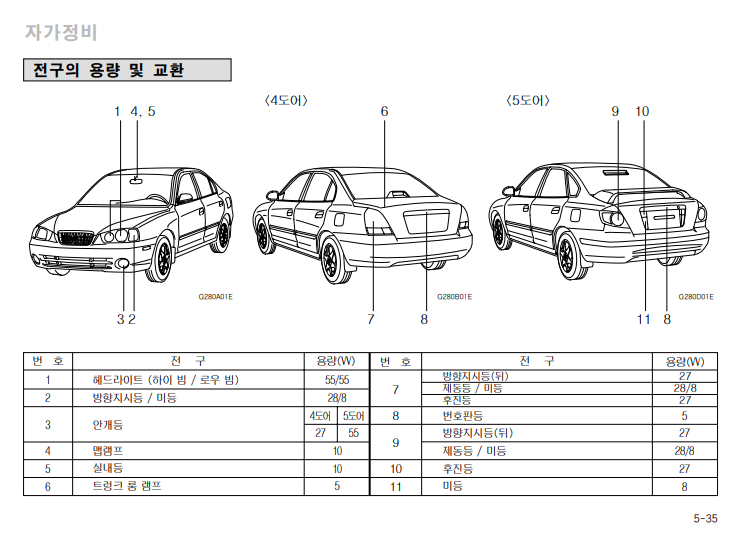 1. 먼저 아래 정비지침서에서 보이는 각 부위 별 전구 스펙을 확인한다.
